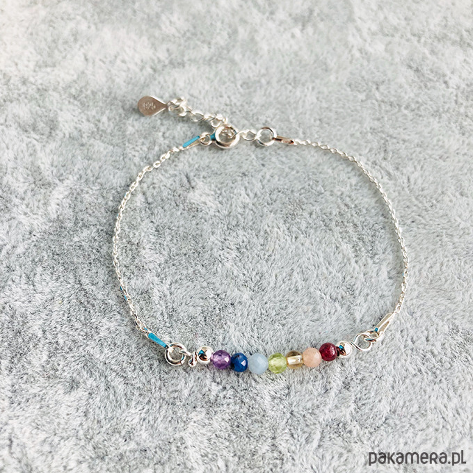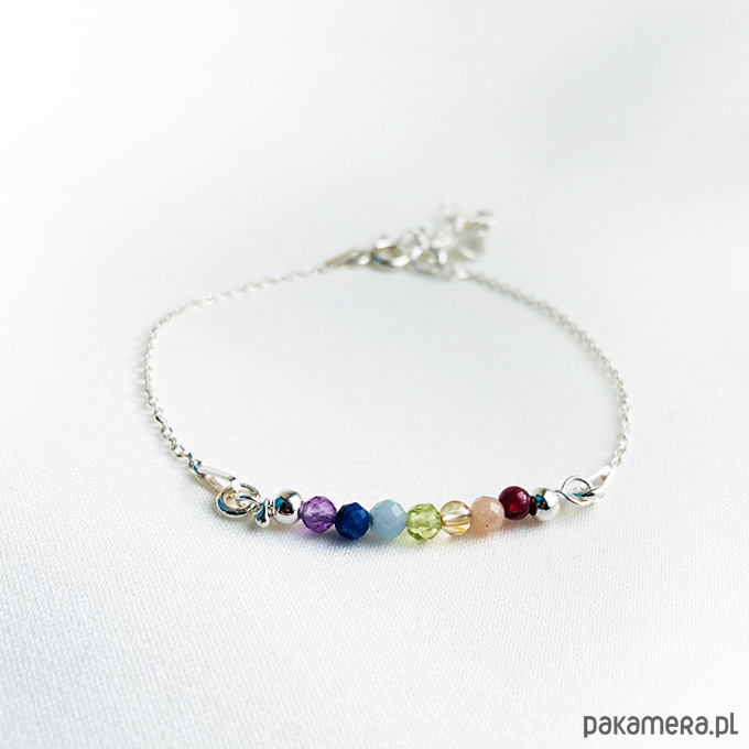 Delikatna bransoletka z kamieni w kolorach reprezentujących wszystkie 7 czakr: ametyst, lapis lazuli, angelit, oliwin, kamień słoneczny i granat. Pięknie wygląda łączona z innymi bransoletkami z kolekcji .