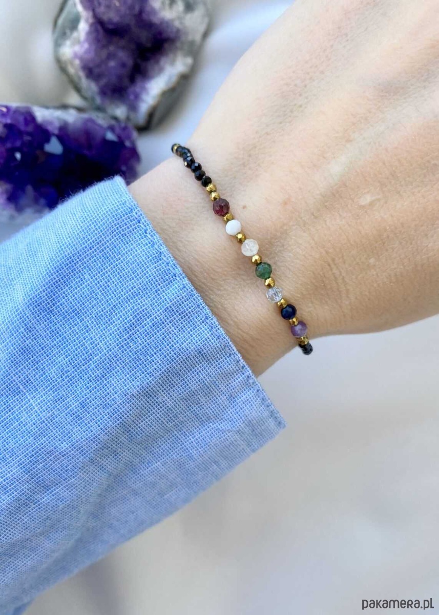 Oprócz siedmiu kamieni czakralnych, Bransoletka Czakralna została wzbogacona o czarny turmalin, który jest jednym z najsilniejszych kamieni ochronnych. Neutralizuje negatywne energie, chroni przed stresem oraz wspiera stabilność emocjonalną.