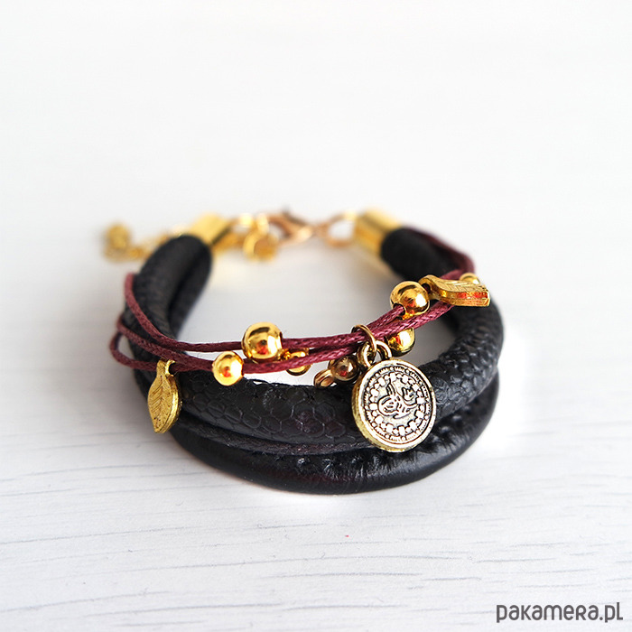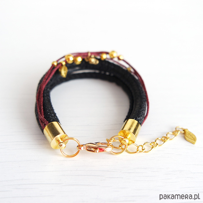 Bransoletka zrobiona jest z rzemieni z eko-skóry oraz sznurka.