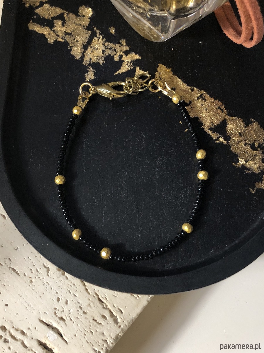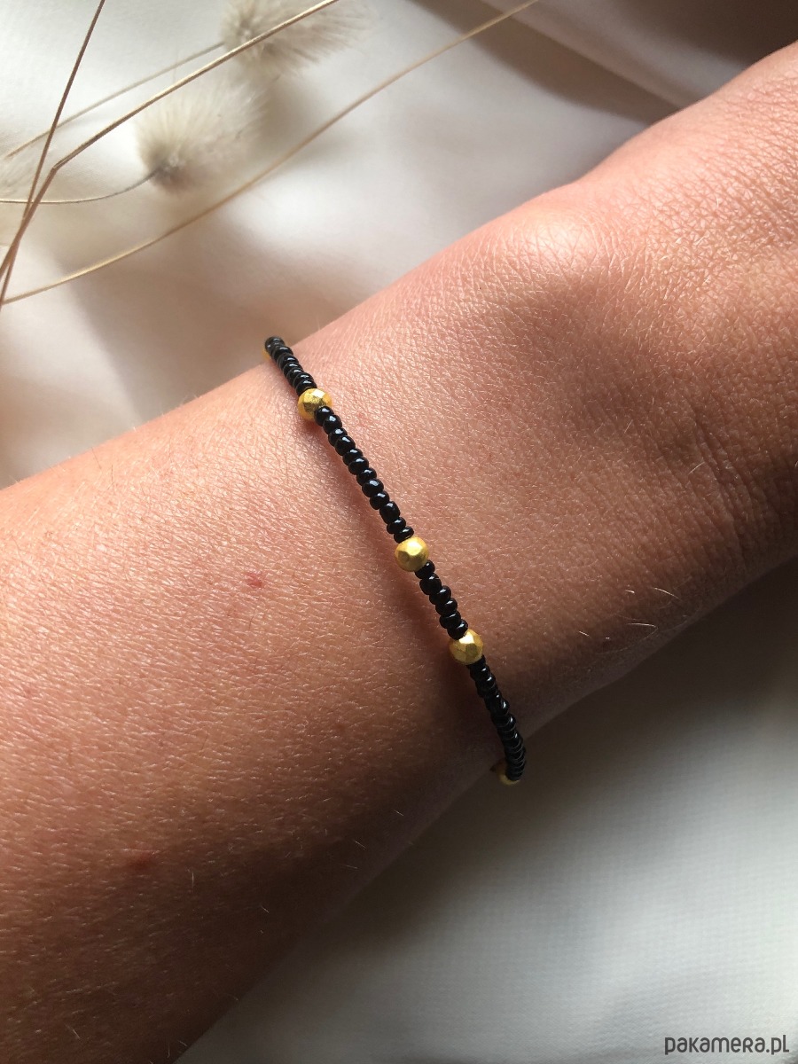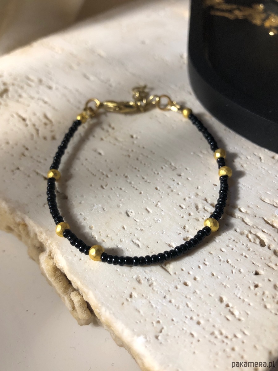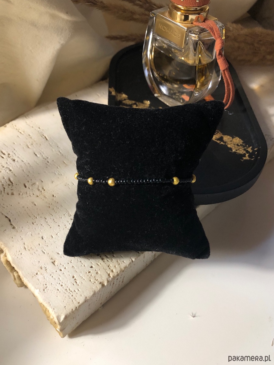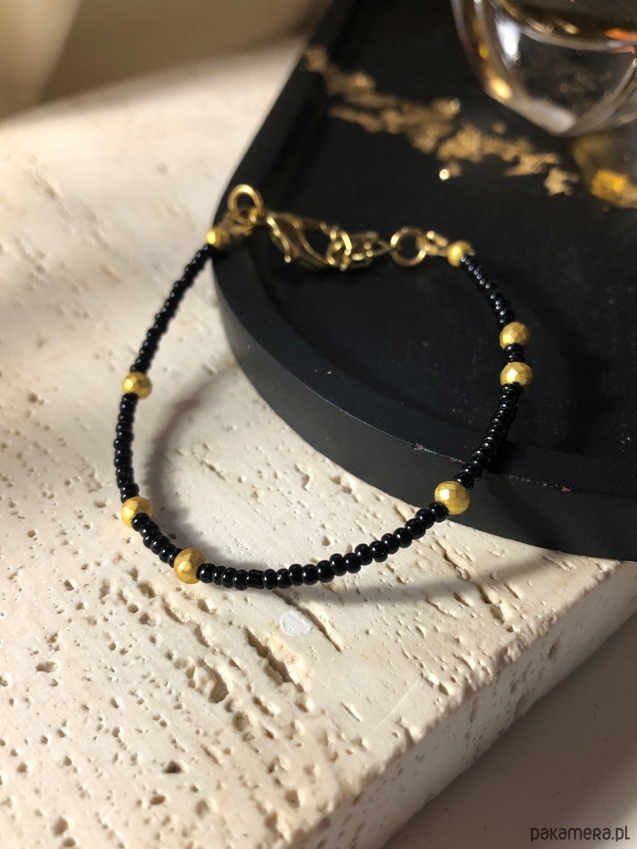 Bransoletka wykonana z naturalnych kamieni i koralików akrylowych. Posiada regulowane zapięcie typu karabińczyk. Długość minimalna bransoletki 16 cm, długość maksymalna 18 cm. Na linkę jubilerską nawleczono czarne koraliki oraz złote kulki hematytu platerowanego o średnicy 3 mm.