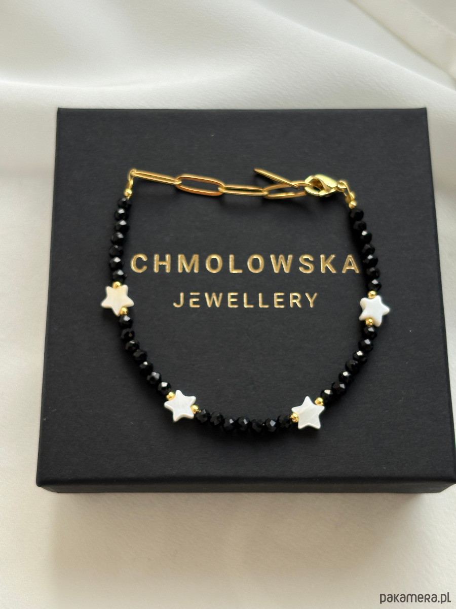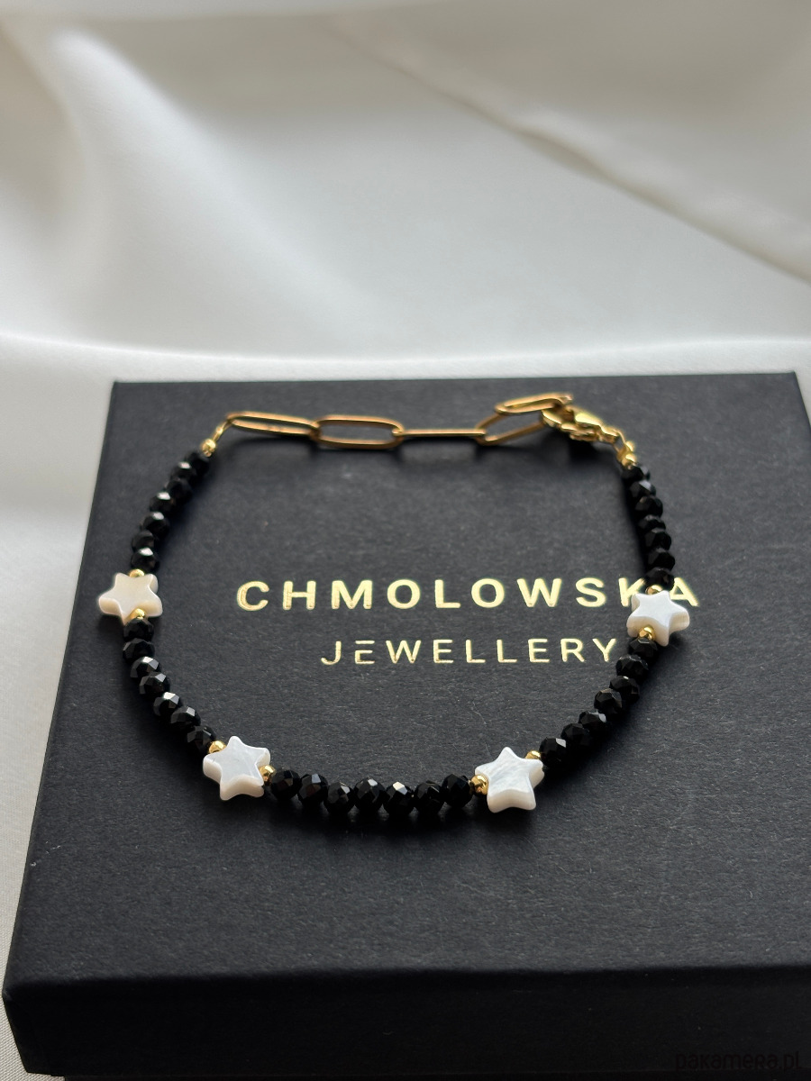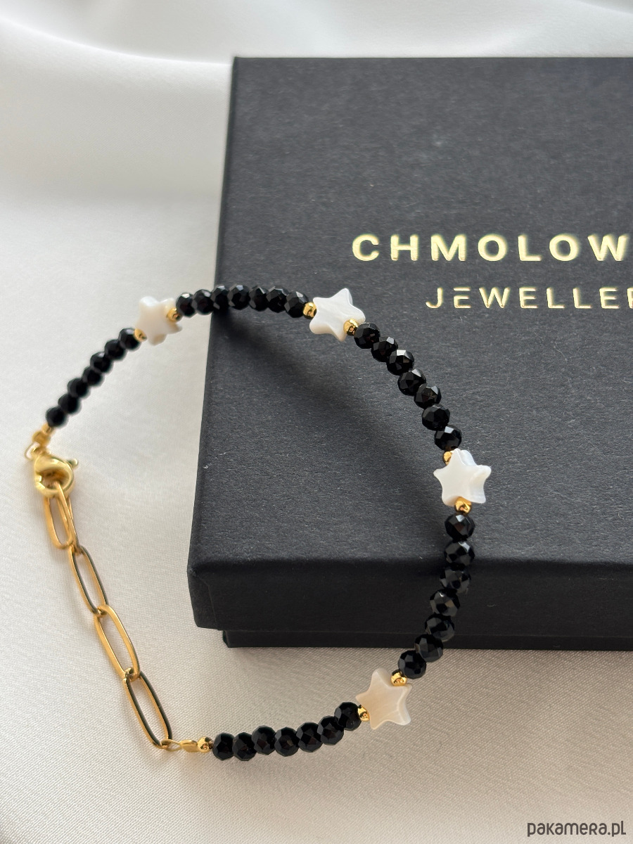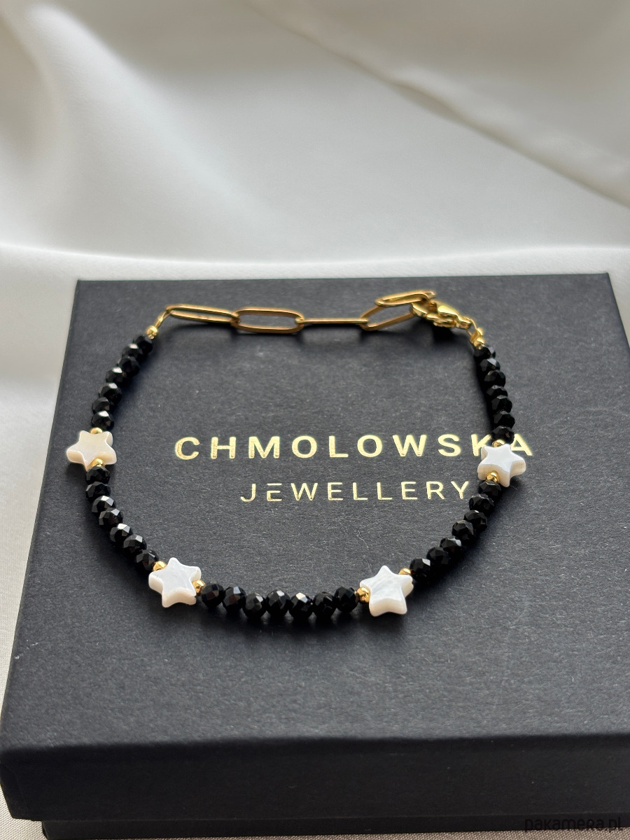 Bransoletka wykonana została na lince jubilerskiej z kamieni onyks, przeplatana gwiazdkami z masy perłowej.