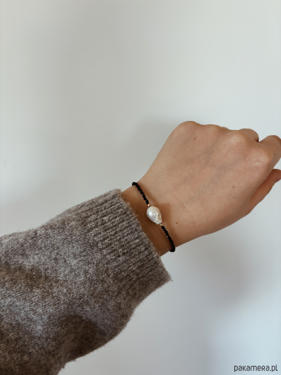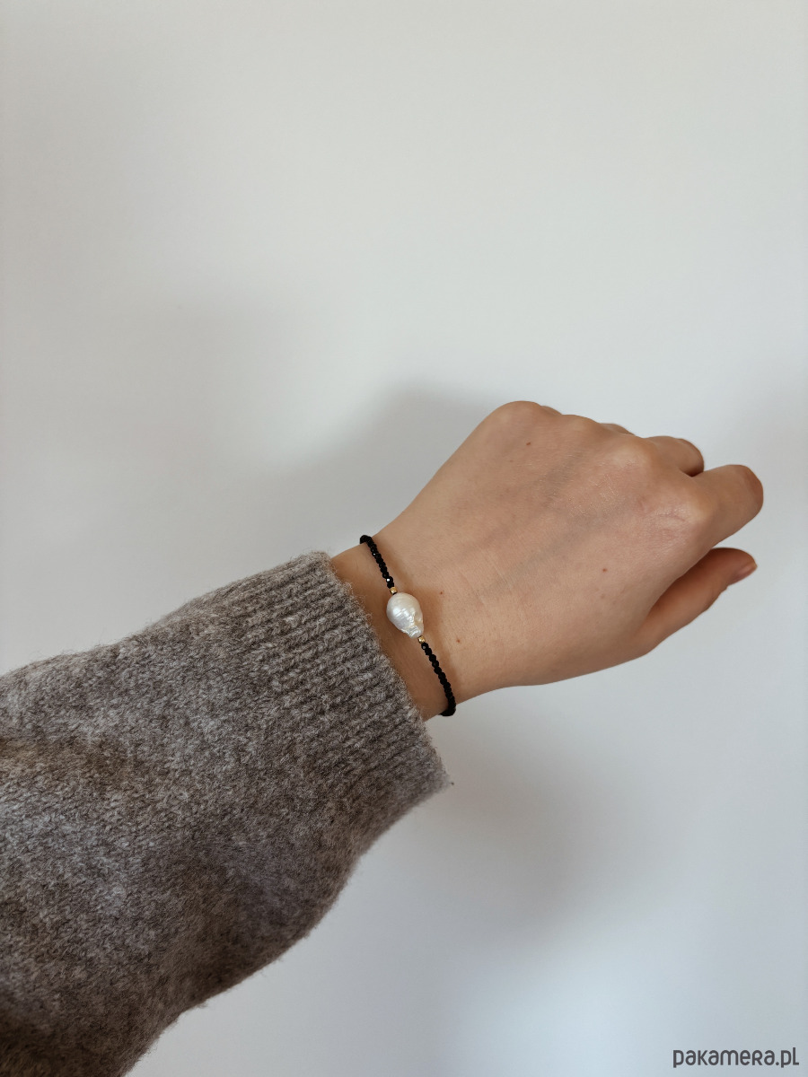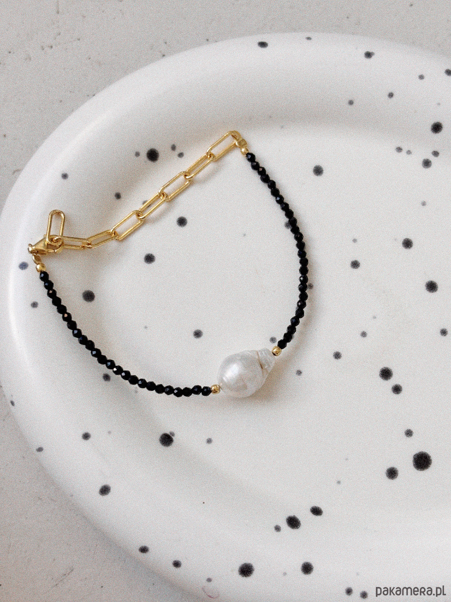 Bransoletka wykonana została na lince jubilerskiej z kamieni onyks i perły barokowej.