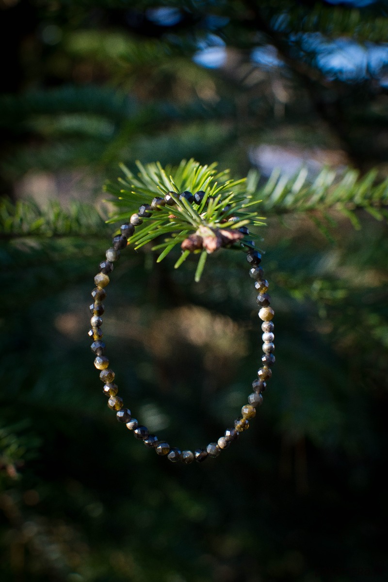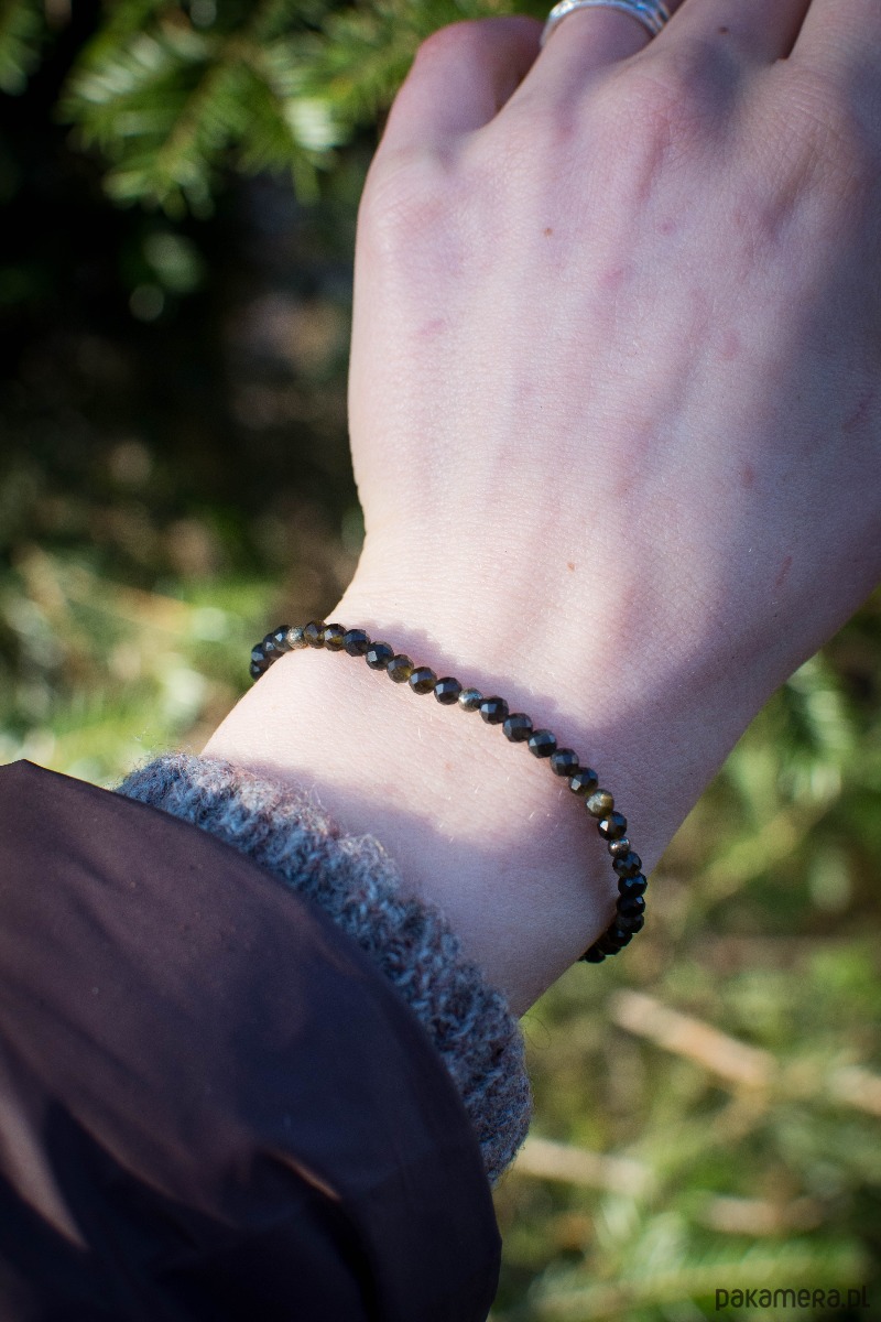Materiały ~ elastyczna gumka jubilerska, złoty obsydian fasetowany, piryt, srebrny element ze stali szlachetnej.