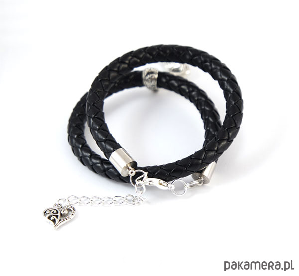 Bransoletka wykonana jest z czarnego, plecionego rzemienia z eko-skóry.