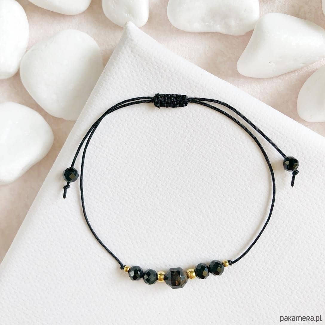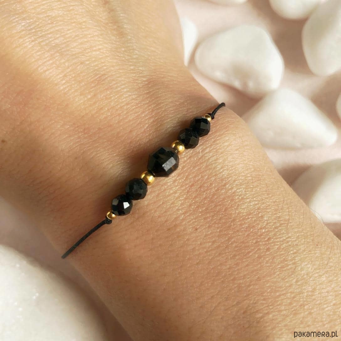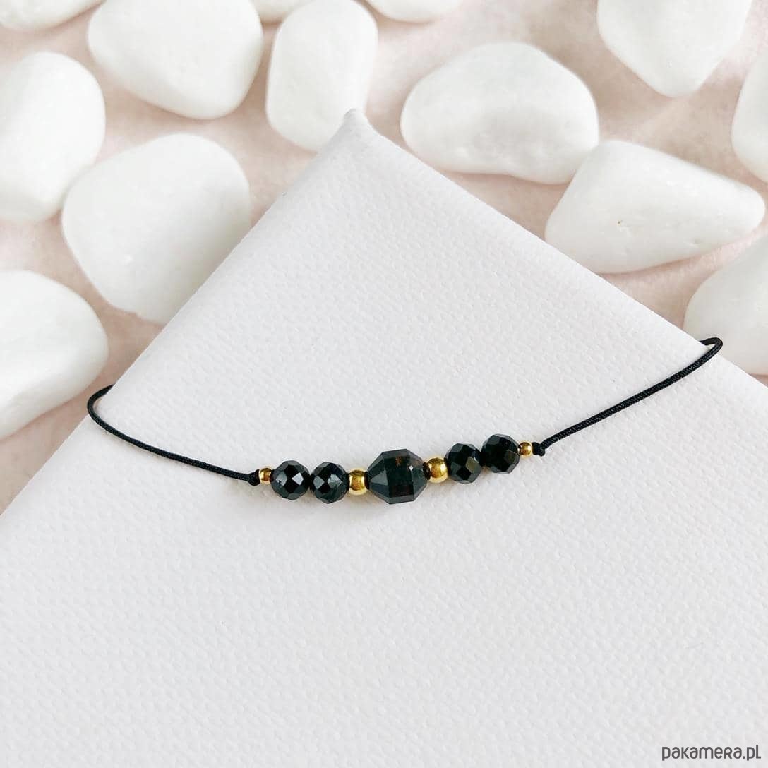 Bransoletka wykonana z kamieni naturalnych - czarnego turmalinu w formie bryłki w centralnej części oraz 6 kuleczek fasetonowych, przekładana kuleczkami ze stali szlachetnej w kolorze złotym.