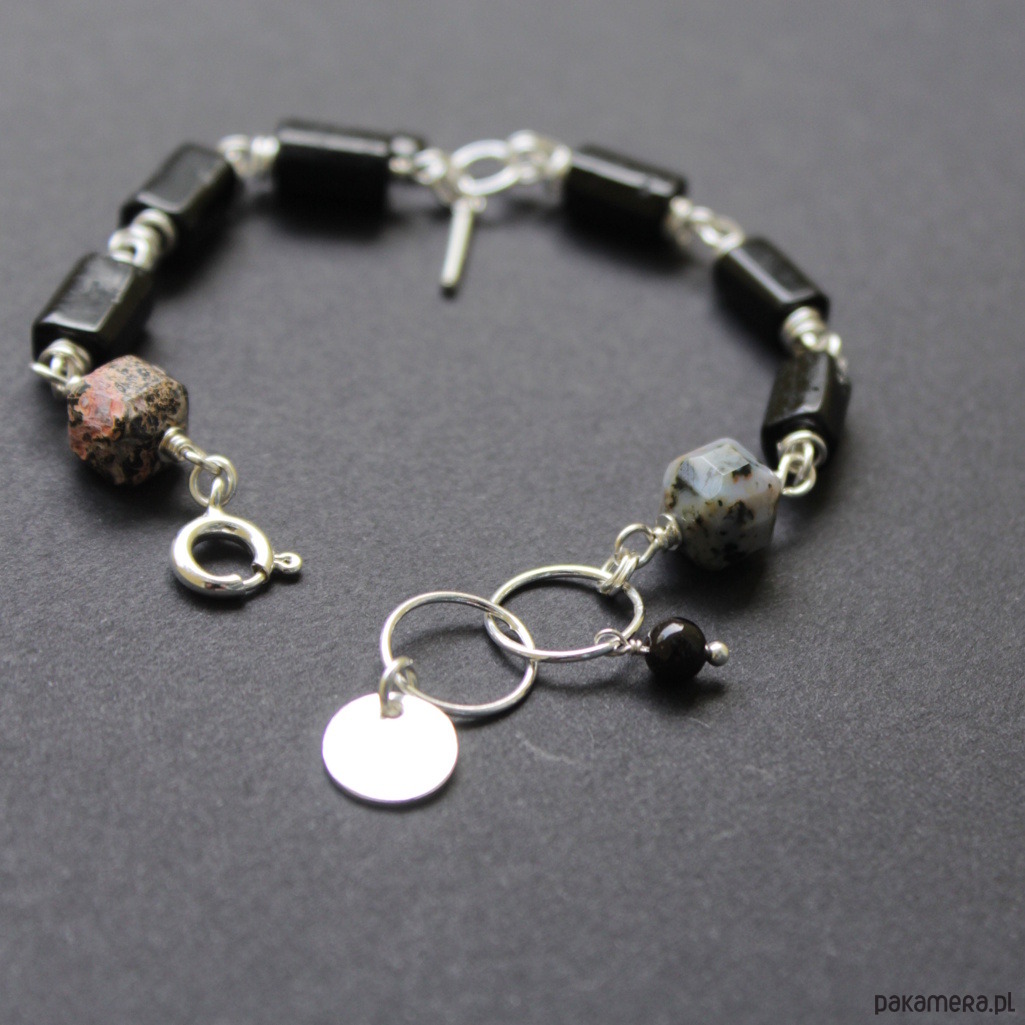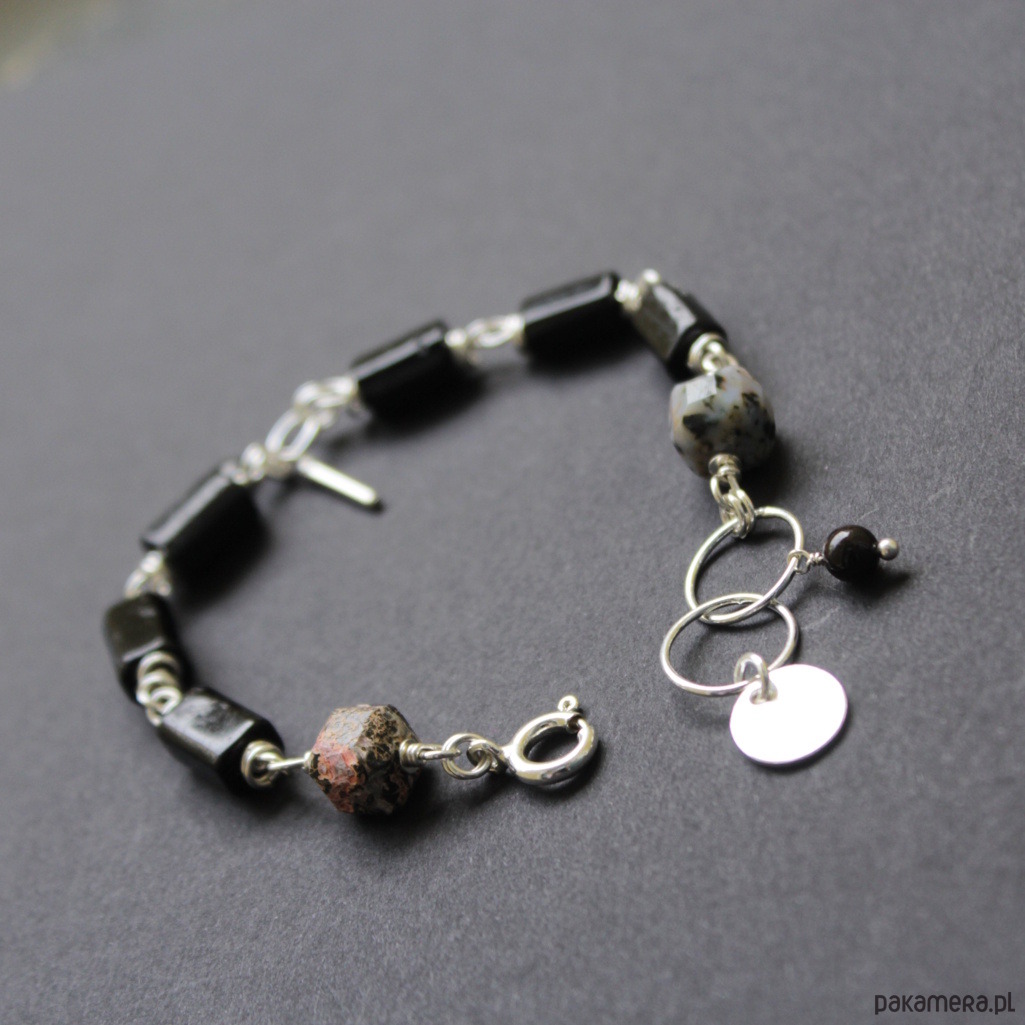 Bransoletka została wykonana ze srebra próby 925 oraz bryłek czarnego turmalinu wielkości 0,9 cm w towarzystwie