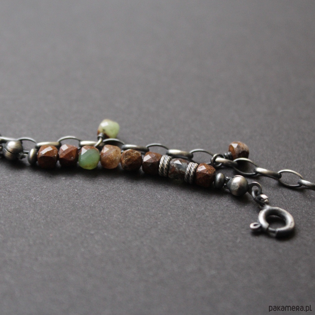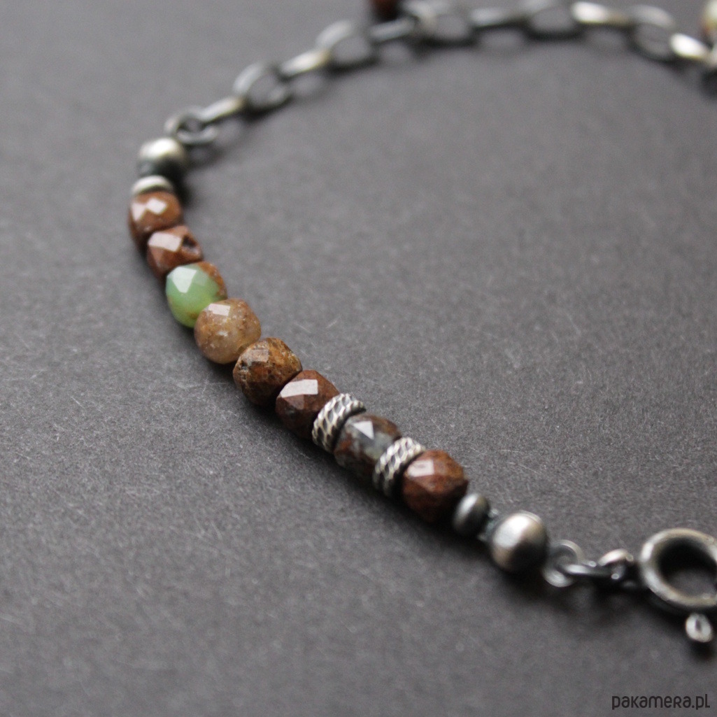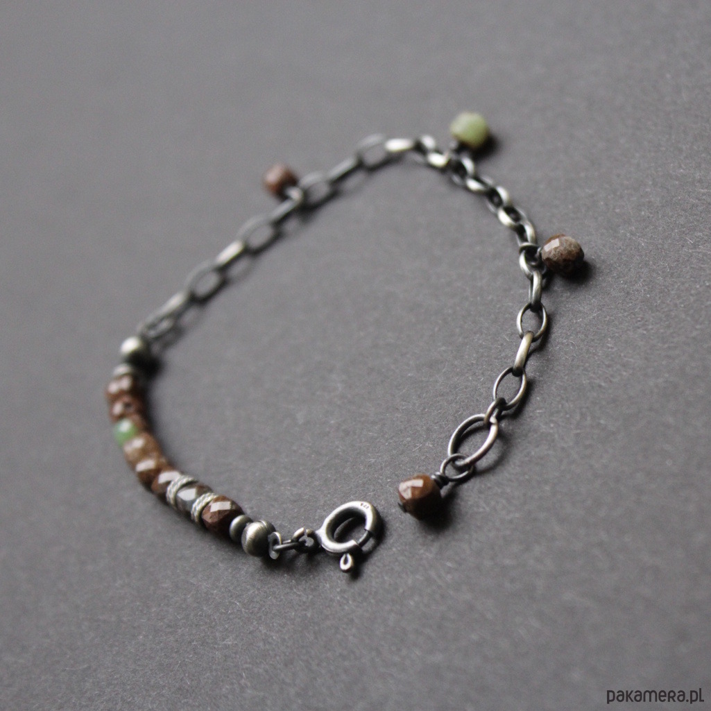 Bransoletka wykonana została z oksydowanego srebra oraz przepięknych kosteczek fasetowanego chryzoprazu z kolorach brązu.