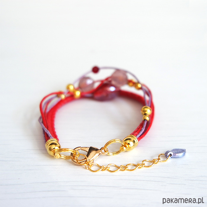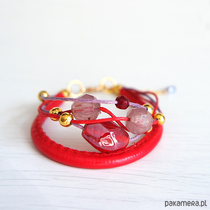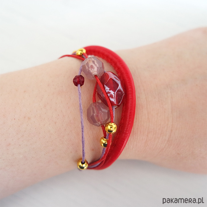 Bransoletka zrobiona jest z rzemienia z eko-skóry i sznureczków.