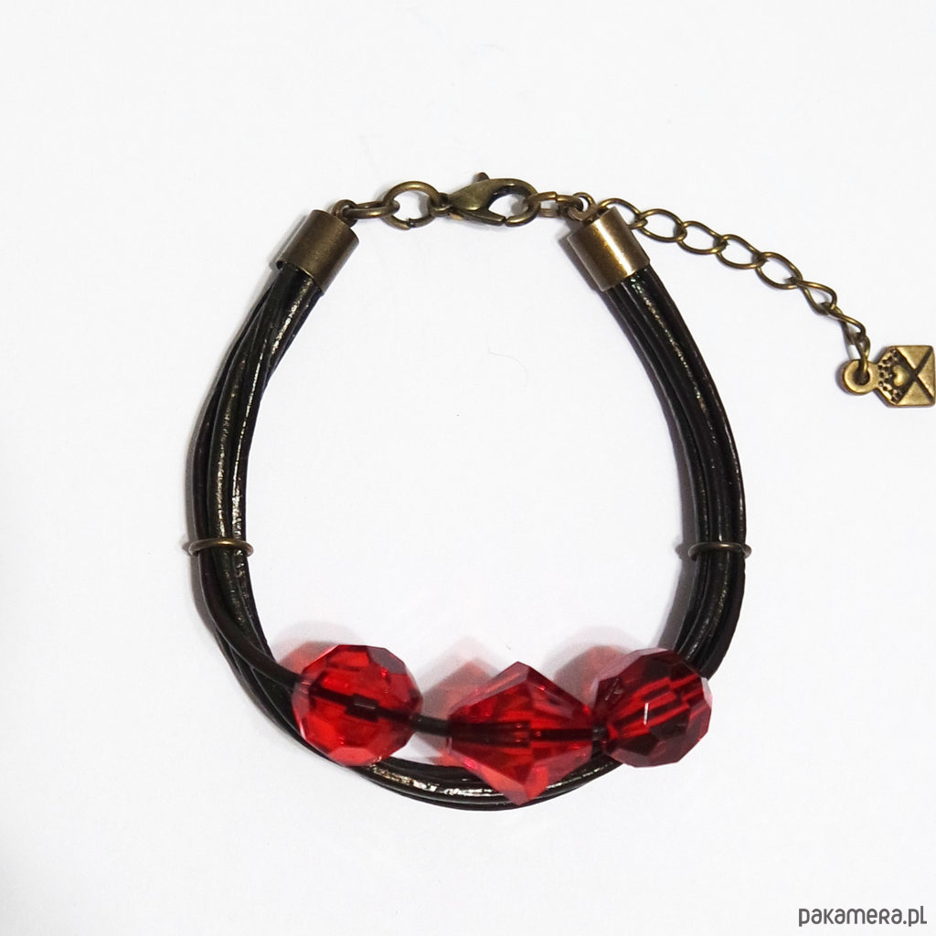 Bransoletka - Czerwone koraliki - skórzana, brązowa