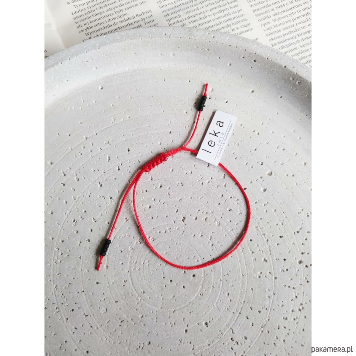 Bransoletka wykonana ze sznurka jubilerskiego w czerwonym kolorze. Sznurek jubilerski najwyższej jakości, nie ściera się i nie traci koloru, jest bardzo mocny. Uzupełnieniem są matowe koraliki ze szkła japońskiego w czarnym kolorze.