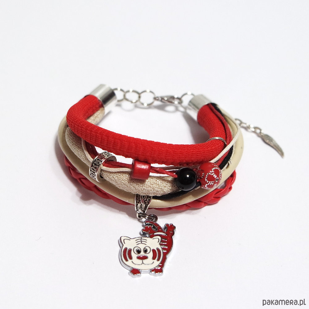 Bransoletka zrobiona jest z rzemieni z eko-skóry, materiału, sznurka, koralików oraz przekładek i emaliowanej zawieszki.