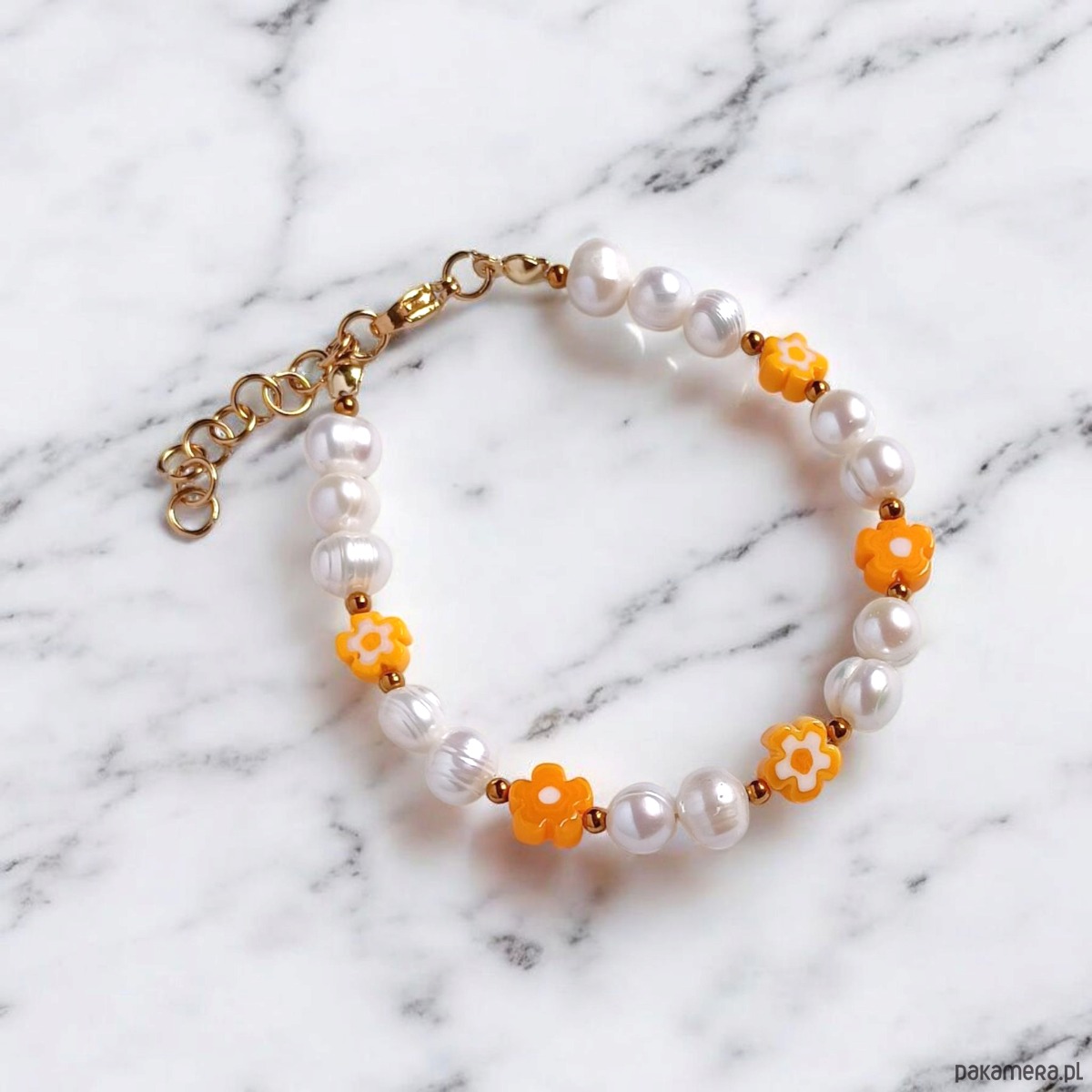 Bransoletka na solidnej lince stalowej (miękkiej) - została wykonana z naturalnych, lekko nieregularnych pereł słodkowodnych(ok. 7-8mm) ,przekładek ze złotego hematytu oraz szklanych kwiatuszków (ok. 7mm).