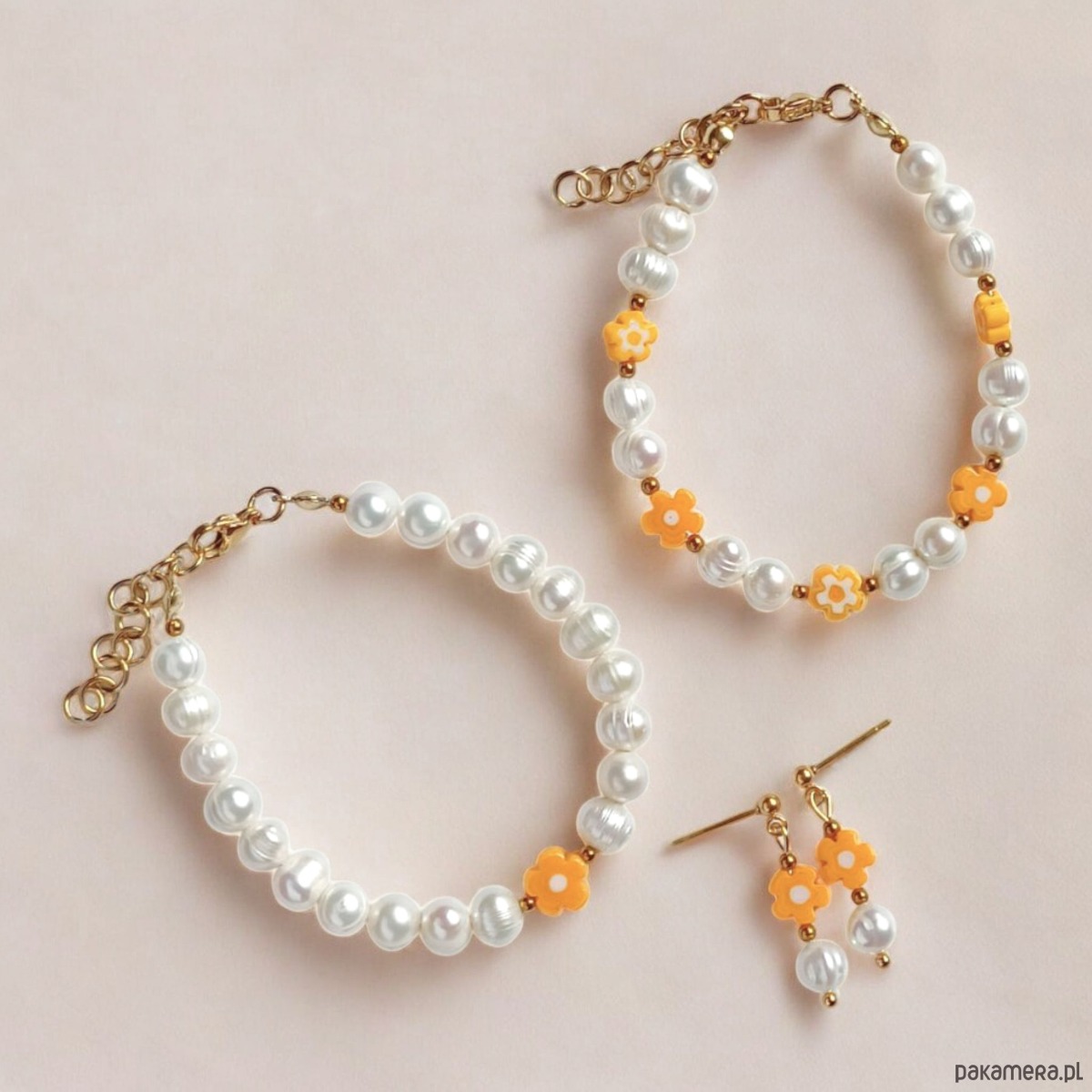 Bransoletka na solidnej lince stalowej (miękkiej) - została wykonana z naturalnych, lekko nieregularnych pereł słodkowodnych(ok. 7-8mm) ,przekładek ze złotego hematytu oraz szklanego kwiatuszka (ok. 7mm).
