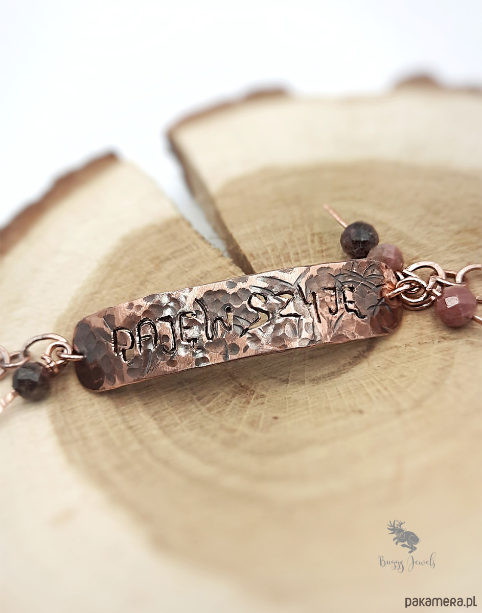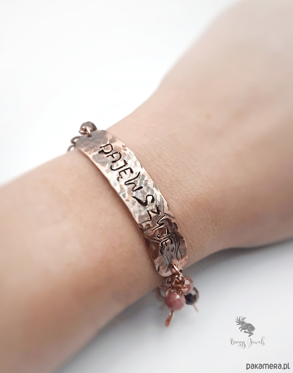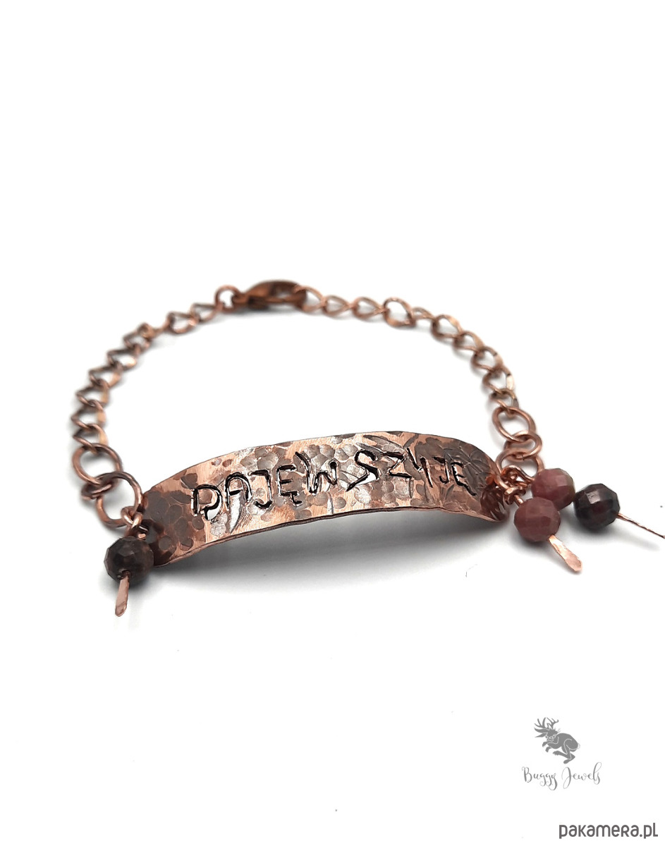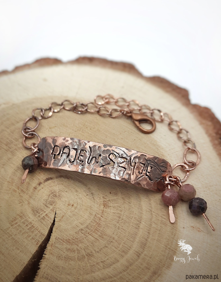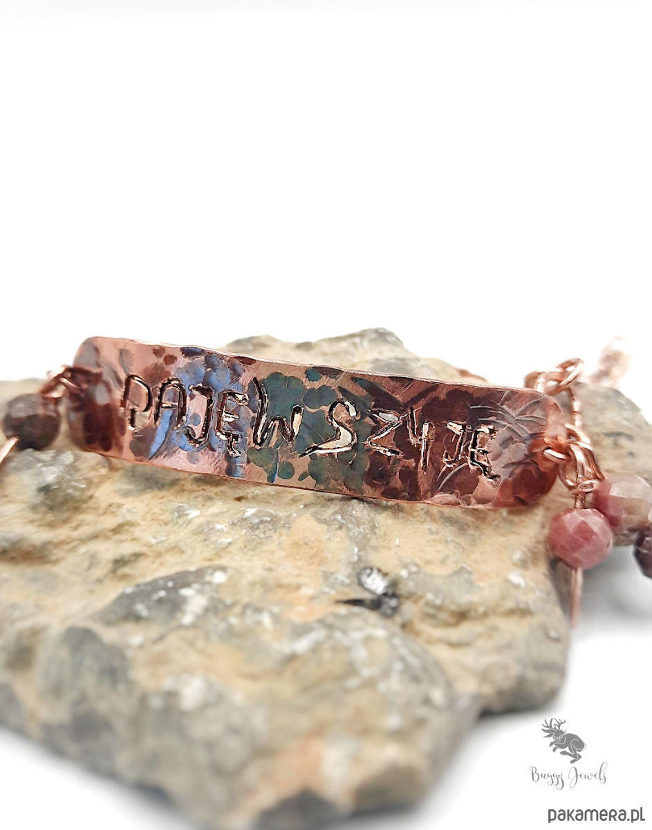 Do bransoletki zostały doczepione koraliki z naturalnego rodonitu oraz łańcuszek do regulacji. Długość bransoletki 16-20 cm.