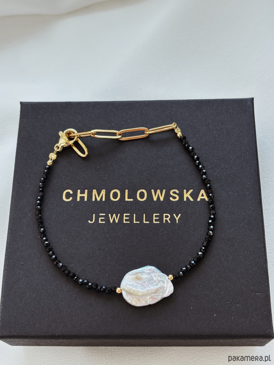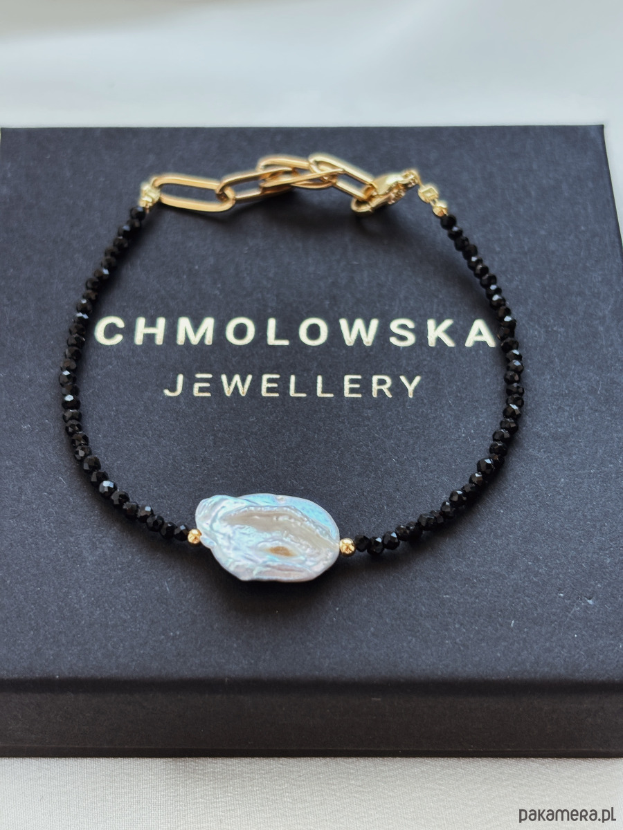 Bransoletka wykonana została na lince jubilerskiej z kamieni onyks i perły naturalnej.