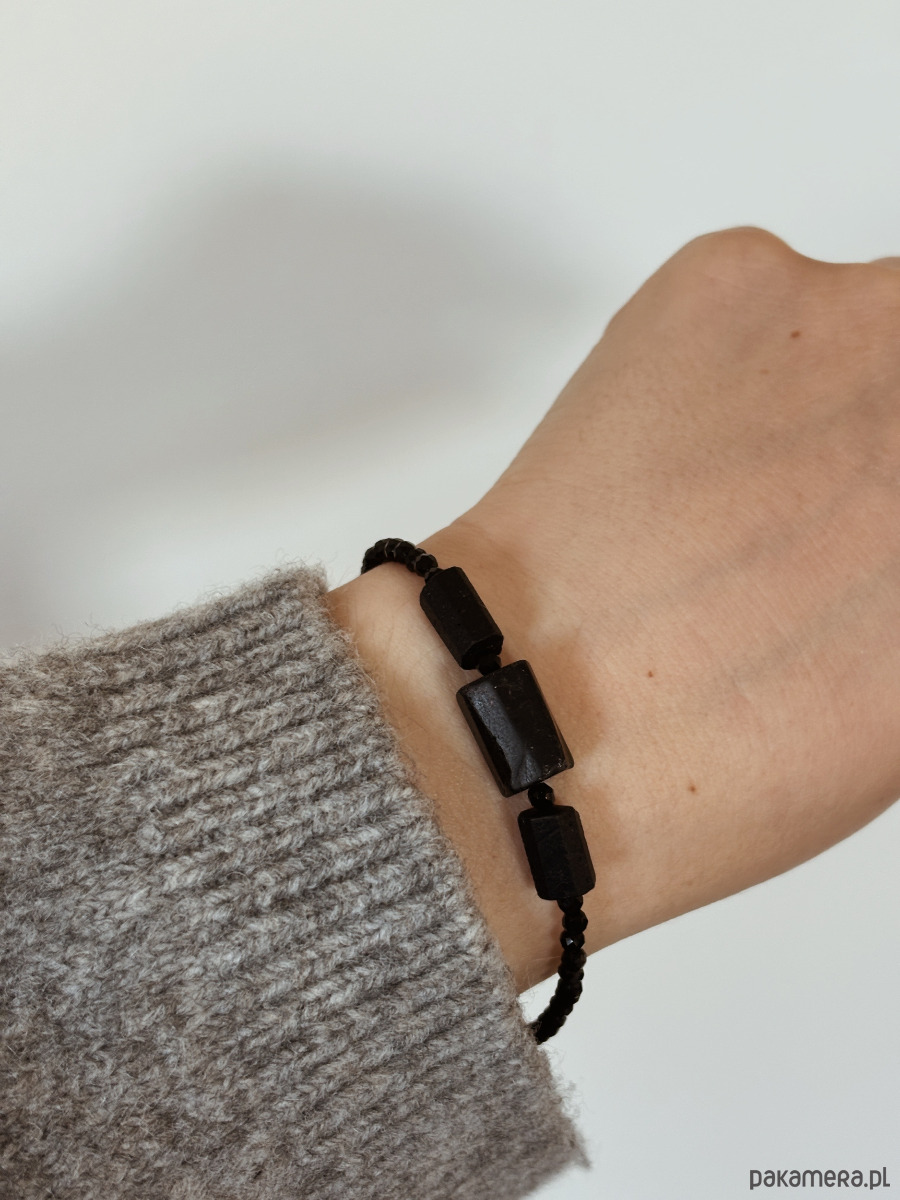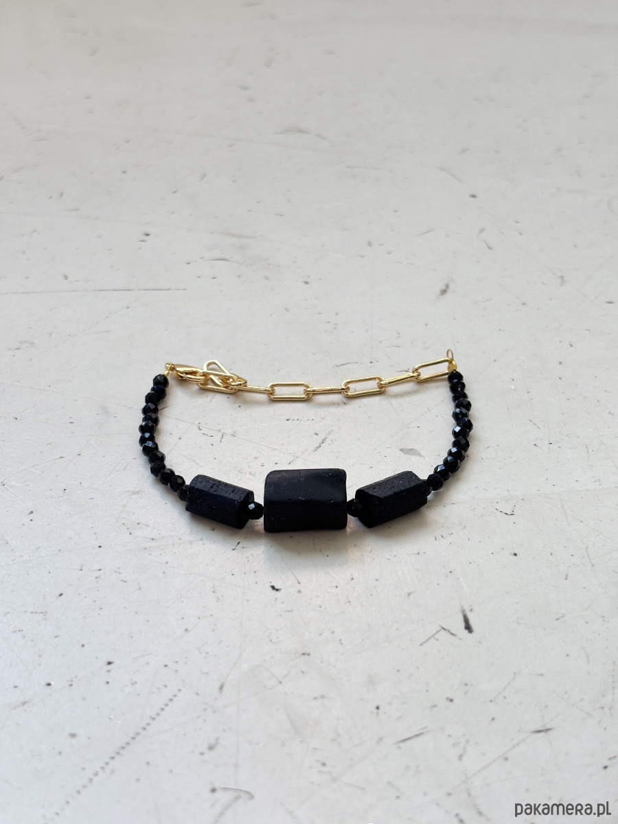 Bransoletka wykonana została na lince jubilerskiej z użyciem wysokiej jakości surowych turmalinów i onyksu, ma regulowane zapięcie.