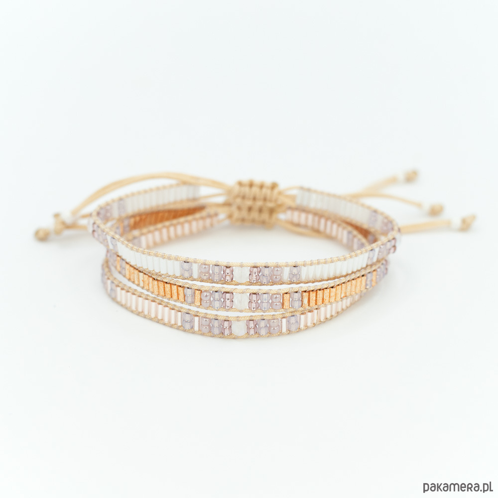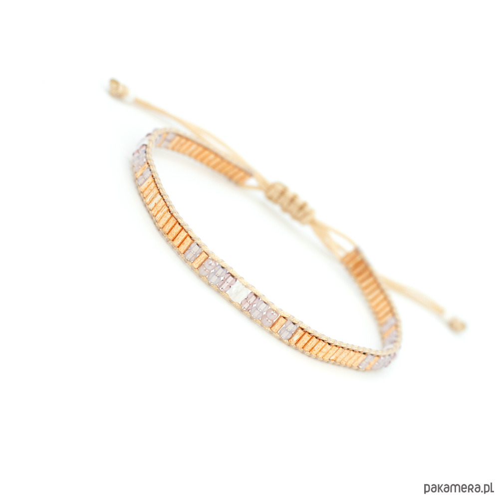 Bransoletka wykonana z koralików szklanych Toho oraz nici i sznurka nylonowego. Kolor dominujący: różowe złoto.