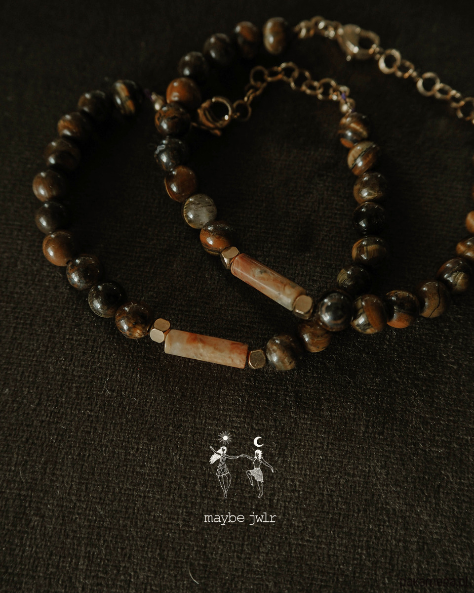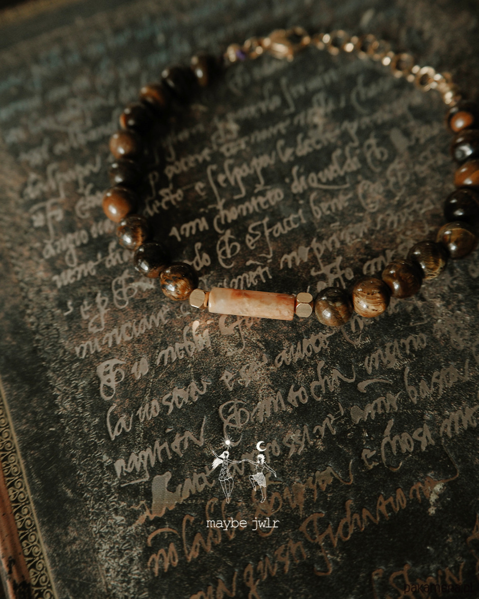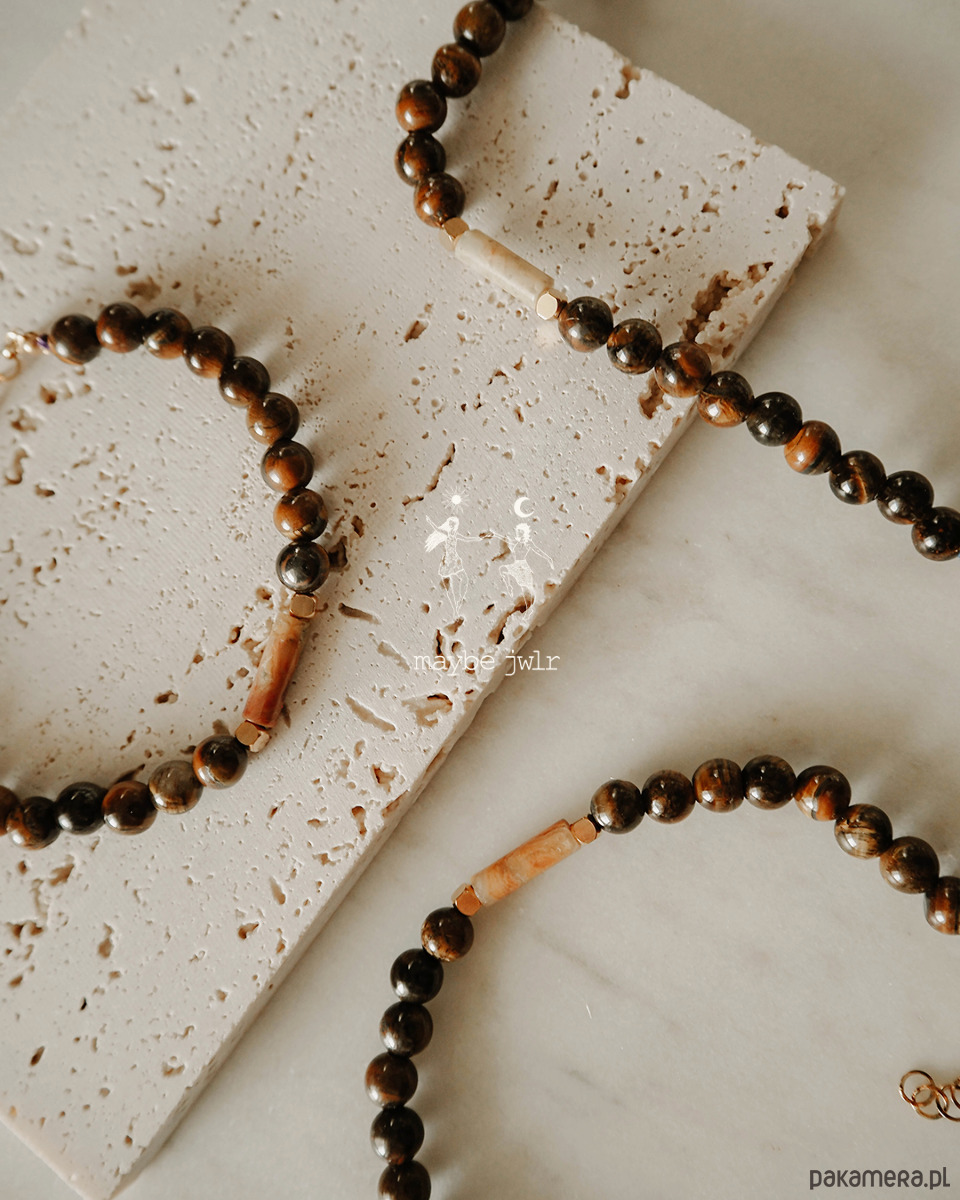Ta bransoletka powstała z naturalnych kamieni oka tygrysiego o wielkości 6 mm, których hipnotyzujący blask i charakterystyczne, falujące paseczki przyciągają spojrzenie niczym światło odbite w głębi oka. W centrum kompozycji znajduje się podłużny kamień agatu cesarskiego, który nadaje całości elegancki akcent i podkreśla szlachetny charakter biżuterii. Ciepłe odcienie głębokich brązów tworzą harmonijną, ponadczasową całość.