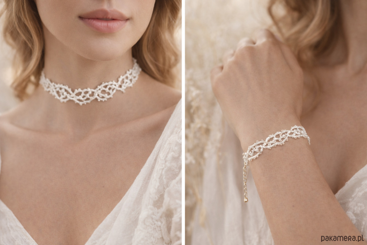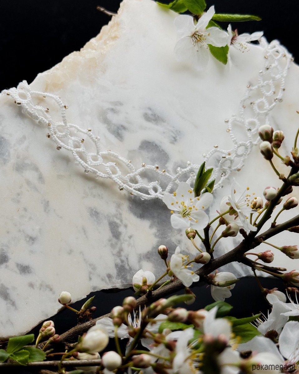 Delikatny, a jednocześnie wyrazisty choker wykonany techniką frywolitki igłowej z wysokiej jakości, maceryzowanej bawełny w kolorze czystej bieli. Subtelny wzór został ozdobiony drobnymi koralikami Toho w odcieniach złota, które pięknie odbijają światło i dodają biżuterii szlachetnego charakteru.