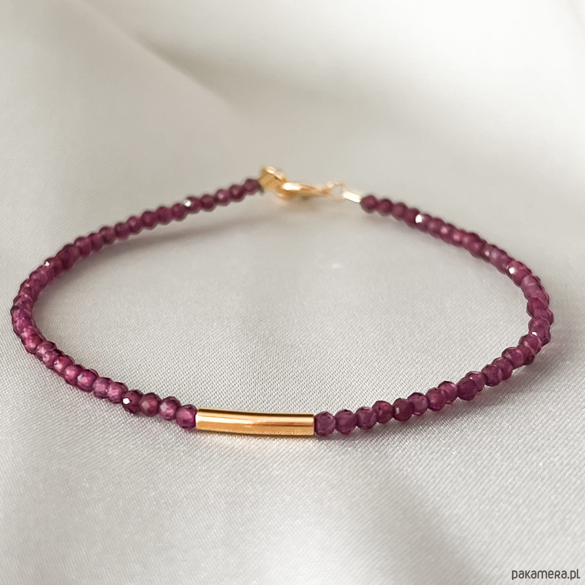 Bransoletka DINA wykonana jest z kamieni granatu oraz przekładki wykonanej ze srebra próby 925 pozłacanej 14k złotem .