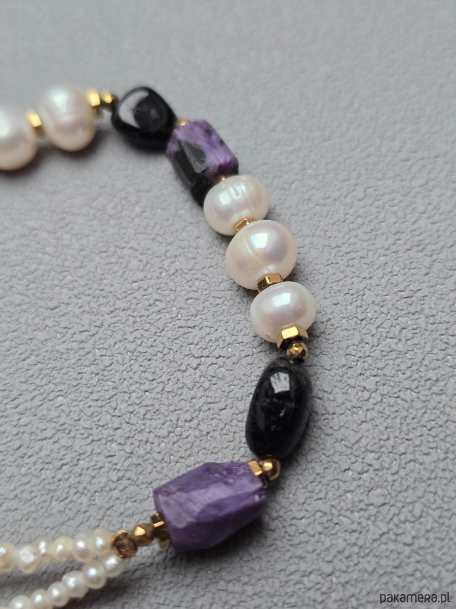 Unikatowa bransoletka wykonana z rzadkiego sugilitu o pięknej fioletowej barwie, któremu towarzyszą perły naturalne i czarny turmalin.