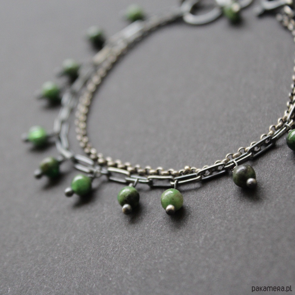 Bransoletka wykonana została z oksydowanego srebra oraz kuleczek diopsydów.