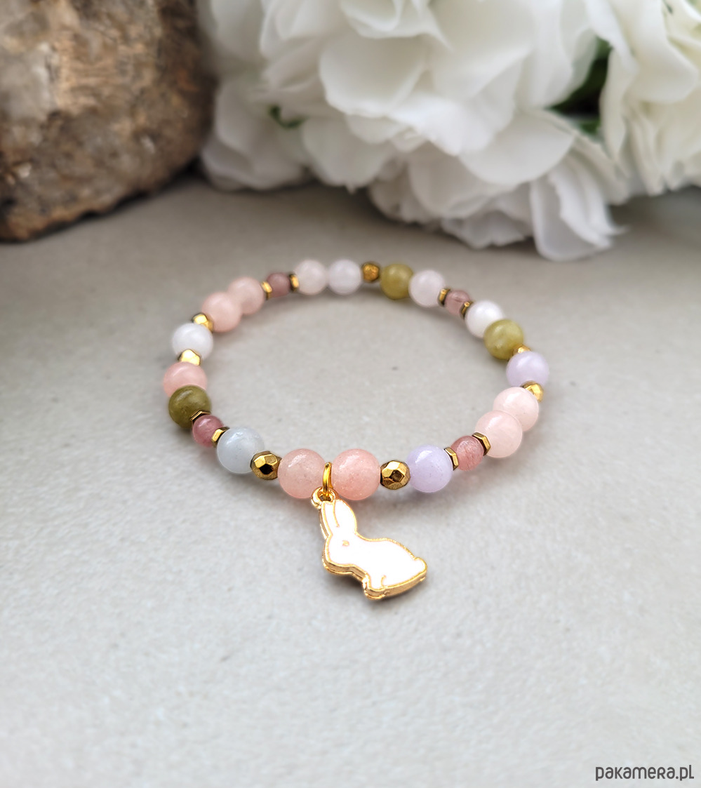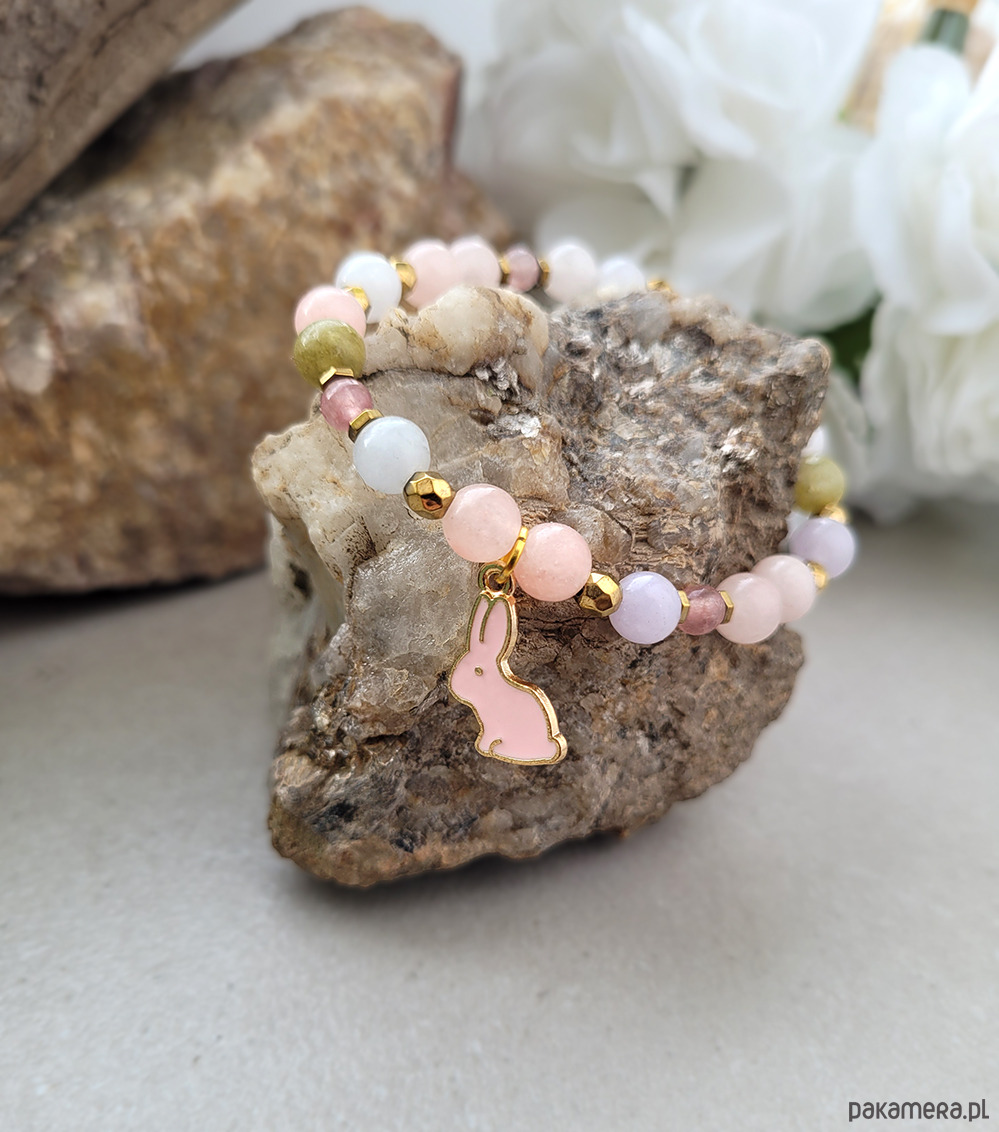 Urocza bransoletka zrobiona z kamieni naturalnych:Morganitu, Opalu różowego oraz Hematytu w kolorze złota .