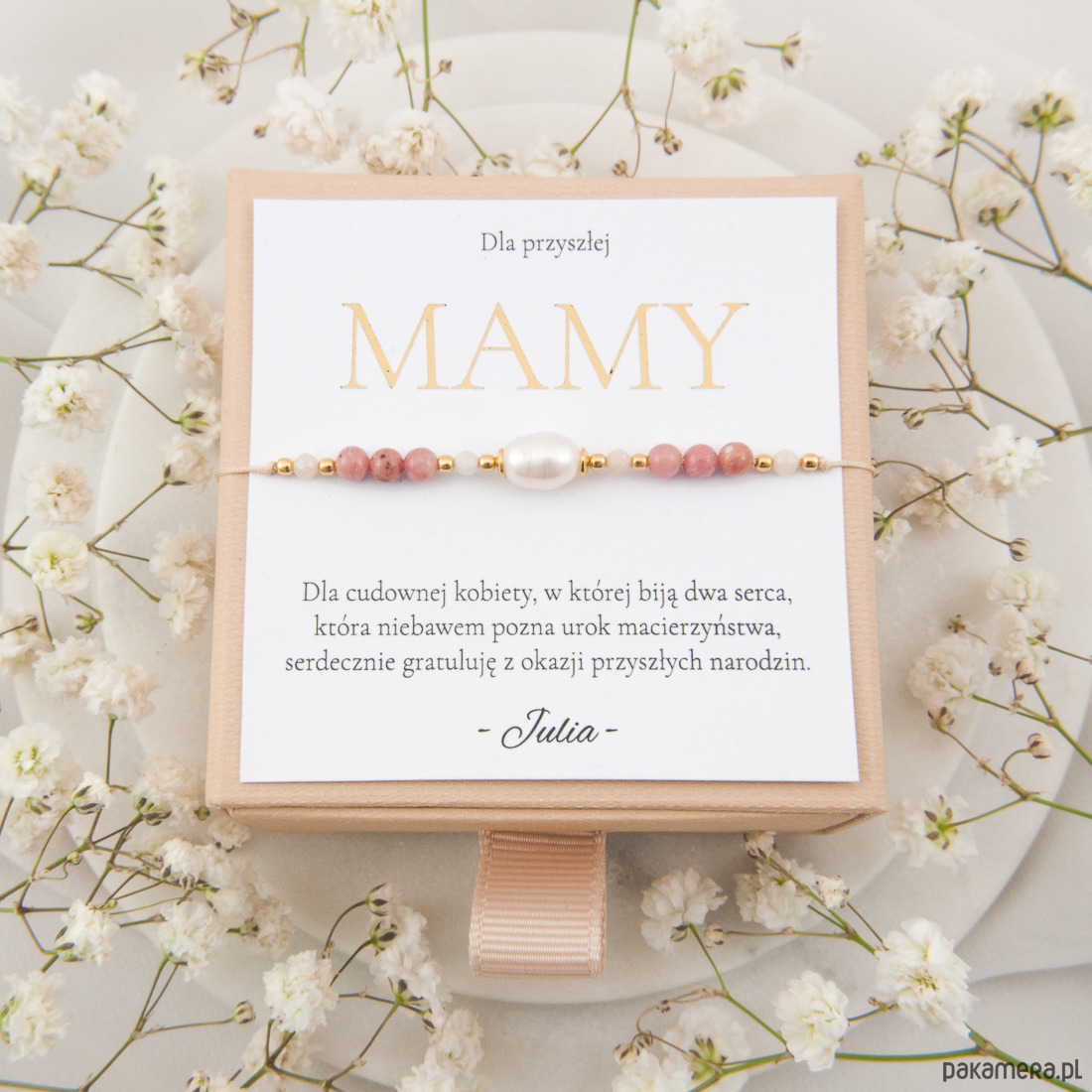 Zestaw obejmuje bransoletkę na ozdobnej karteczce z napisem dla przyszłej mamy, pudełko prezentowe oraz karteczkę z napisem będziesz wspaniałą mamą. Nie zapomnij wpisać we wiadomości do zamówienia imion jakie mają się znaleźć na karteczkach lub dedykację. Np.: