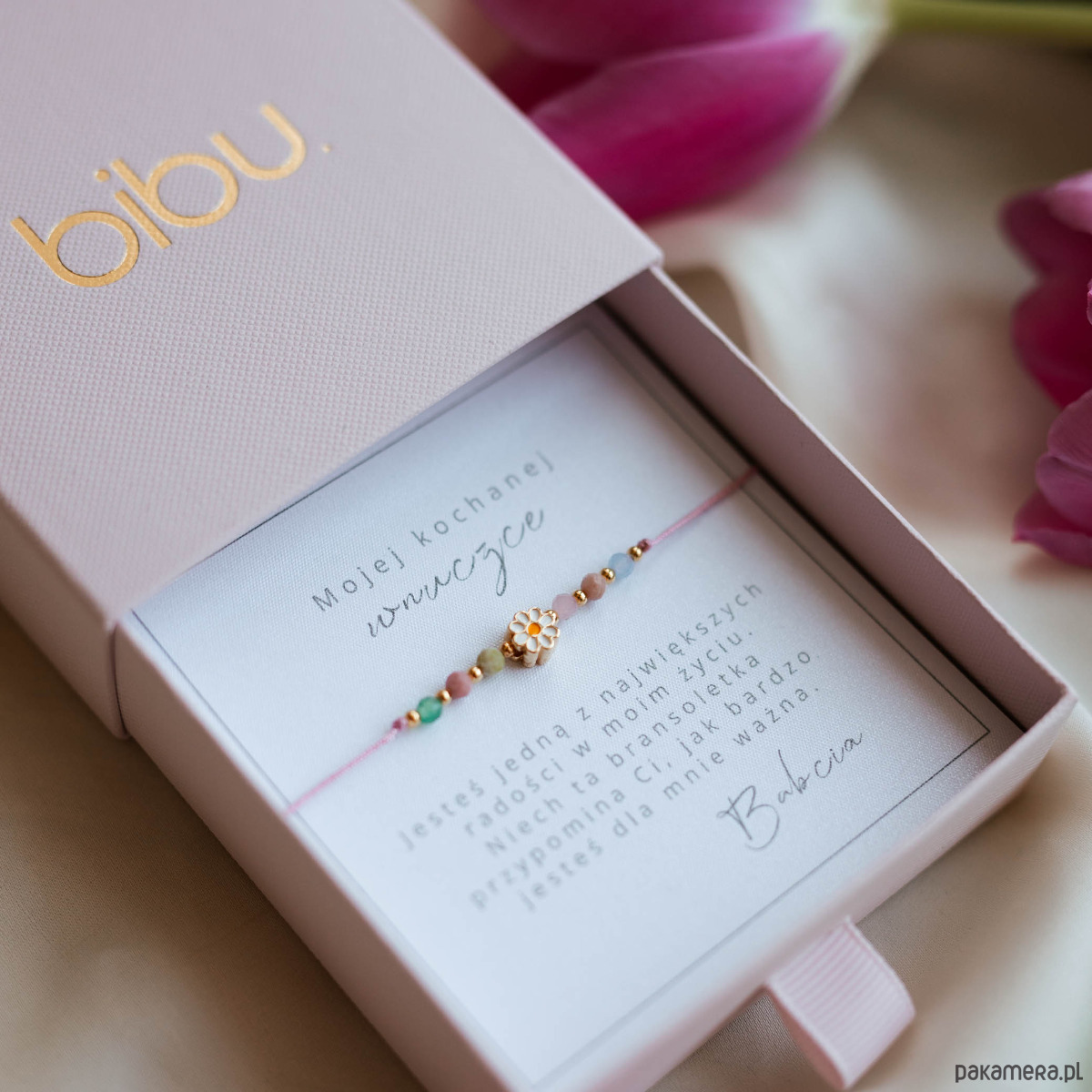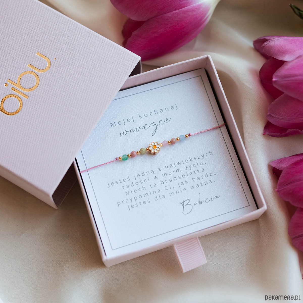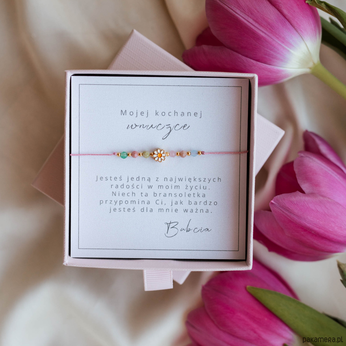 Ta urocza bransoletka z kolorowych kamieni naturalnych została stworzona jako piękny symbol miłości między babcią/dziadkiem a wnuczką. Delikatna zawieszka w kształcie stokrotki dodaje jej radosnego i dziewczęcego charakteru – takiego, który wywołuje uśmiech za każdym razem, gdy się na nią spojrzy.