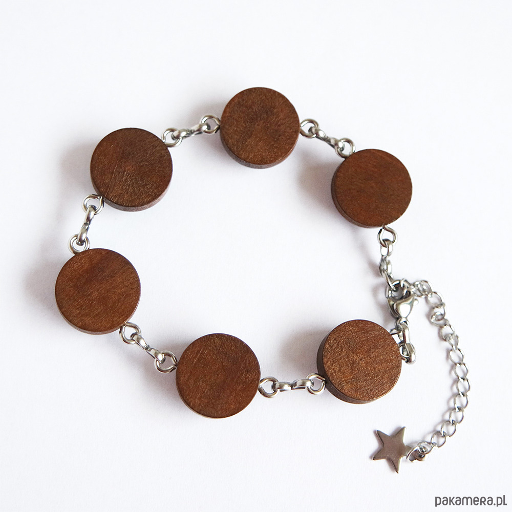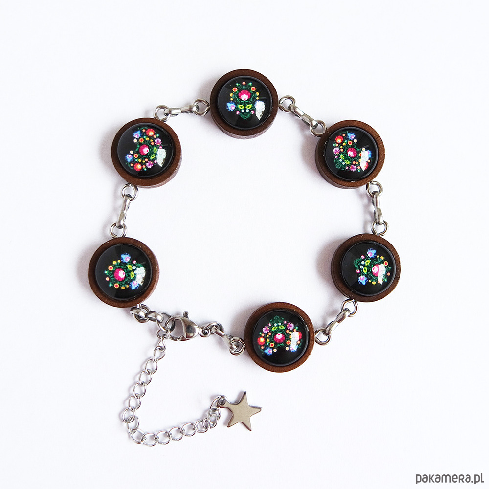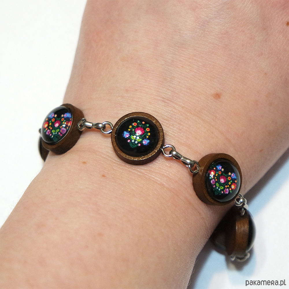 Bransoletka piękne się prezentuje, połączenie drewna, stali nierdzewnej i folkowej grafiki, tworzy unikatową, naturalną biżuterię.