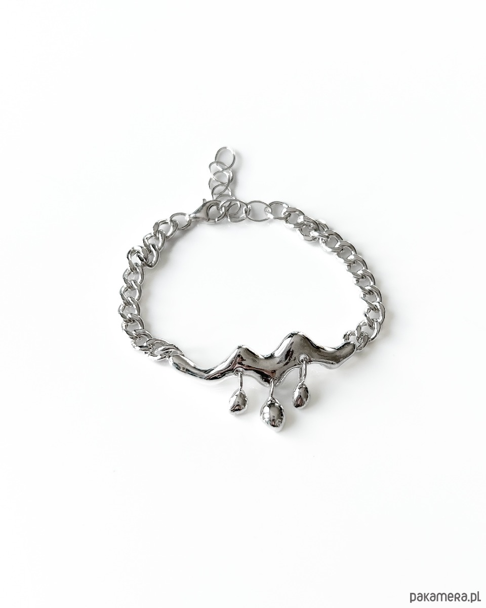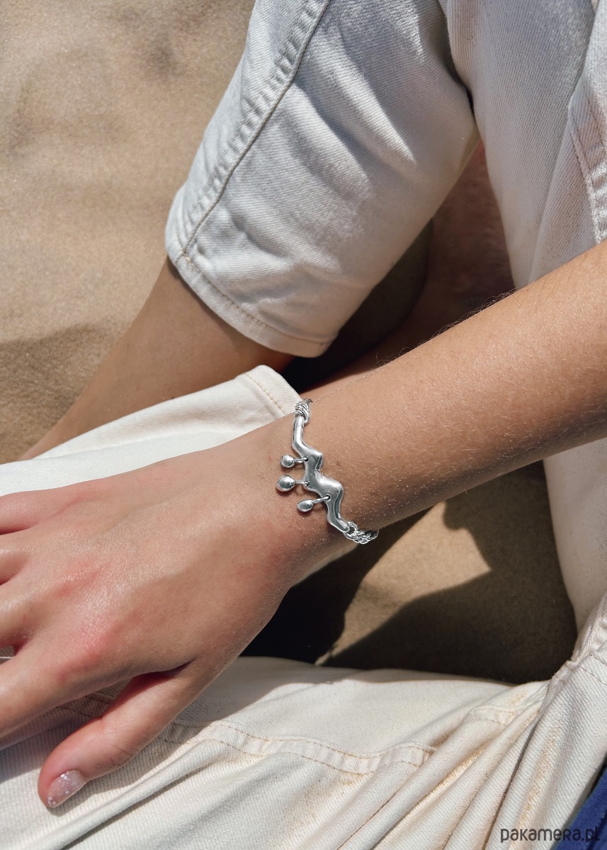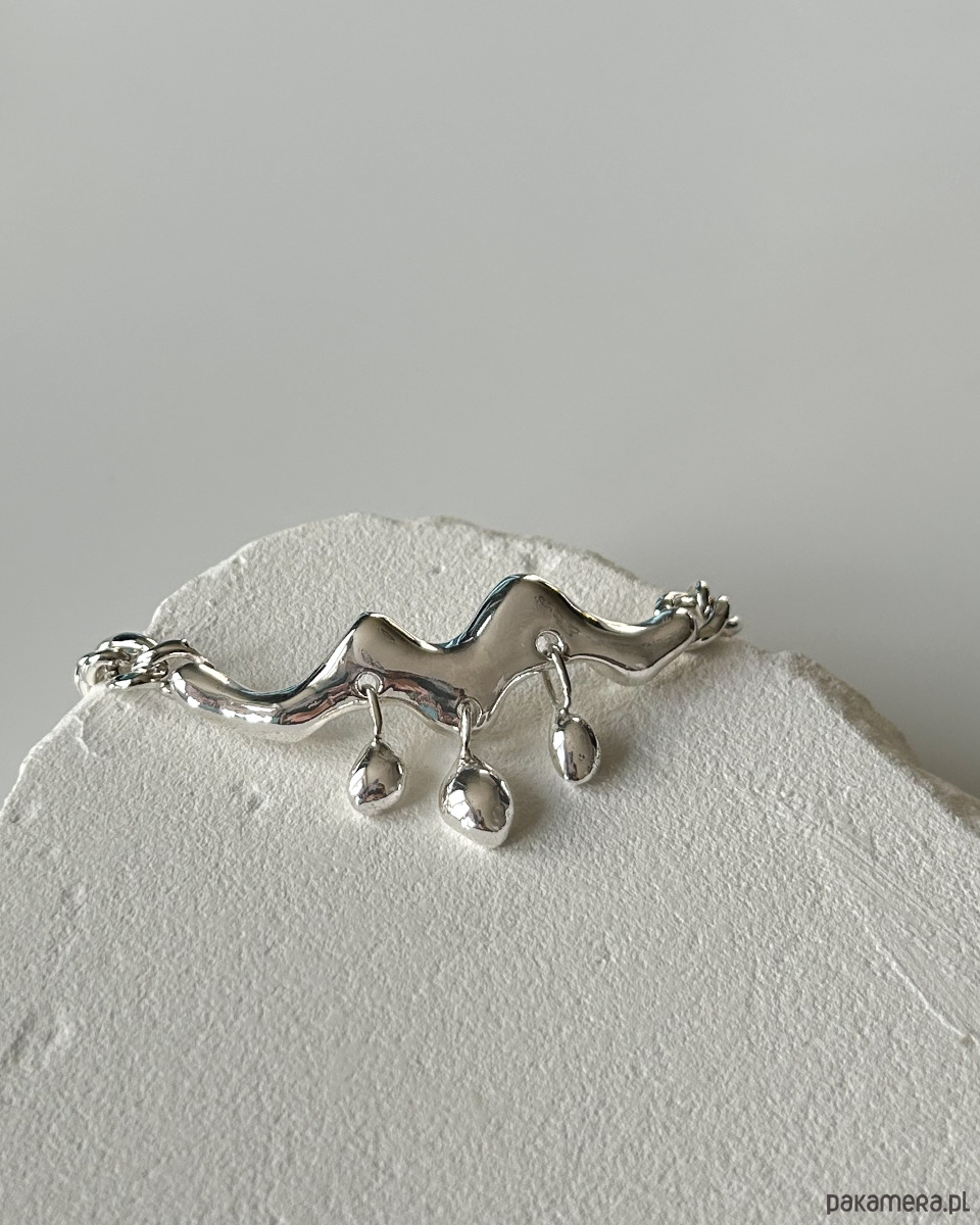 Nieregularna bransoletka w formie lejącego się i ociekającego srebra z wiszącymi kroplami.