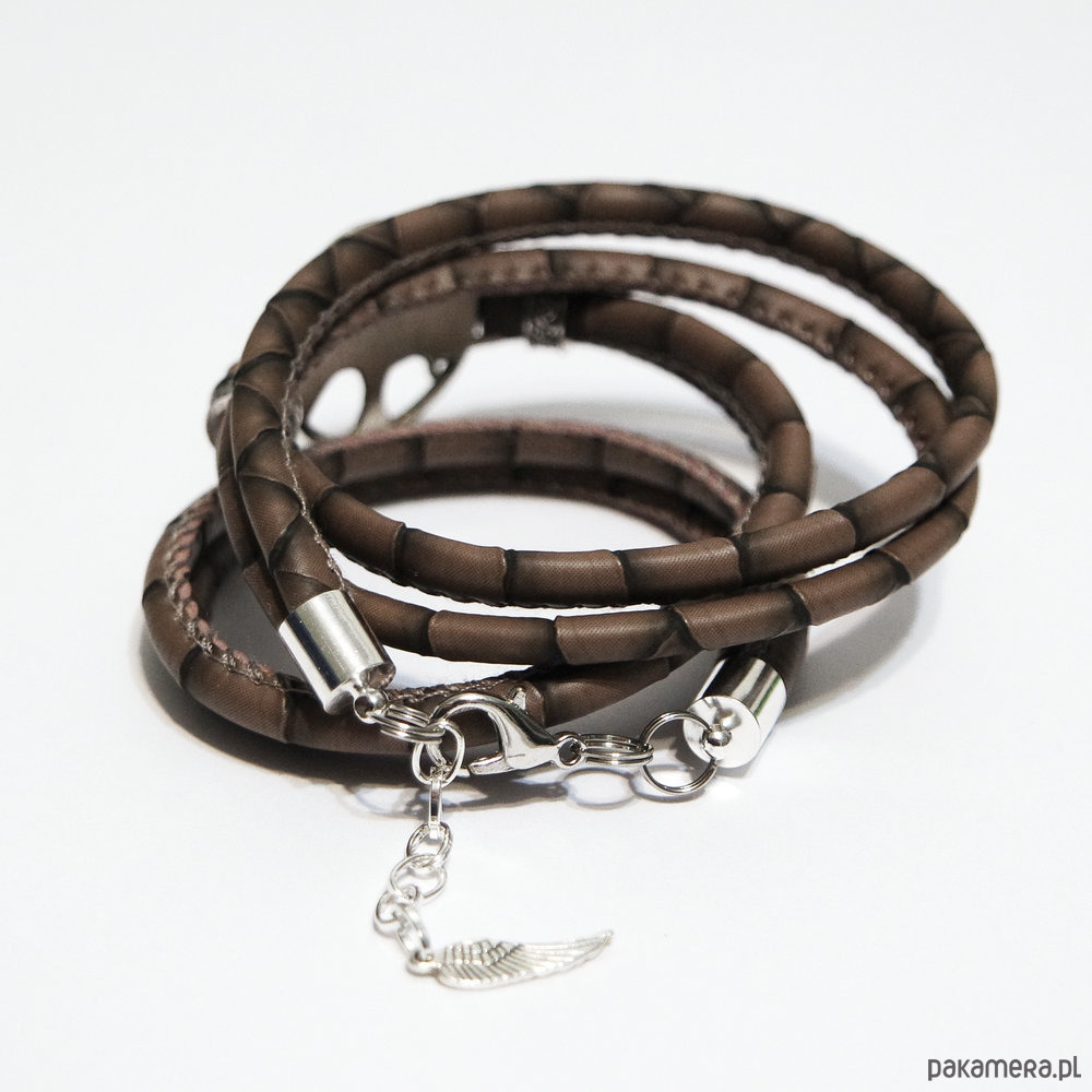 Bransoletka wykonana jest z rzemieni ze skóry ekologicznej.