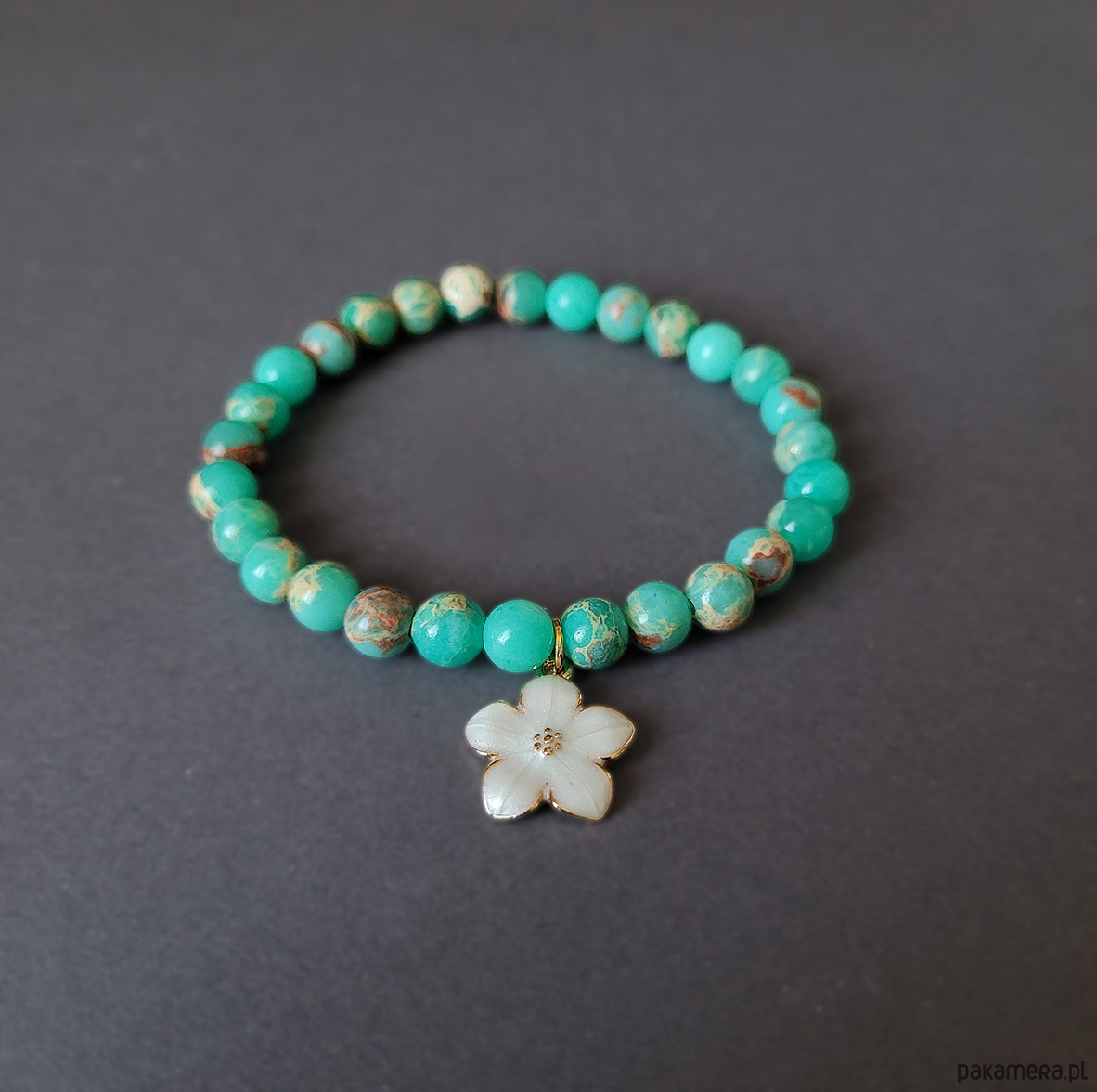 Piękna bransoletka z naturalnych kamieni- Jaspisu cesarskiego Shoushan z przywieszką kwiatem.
