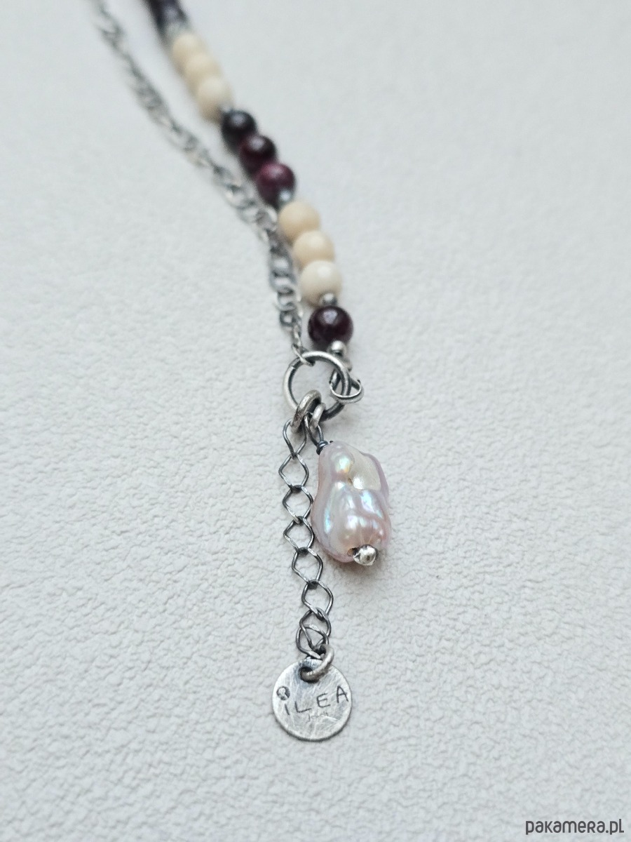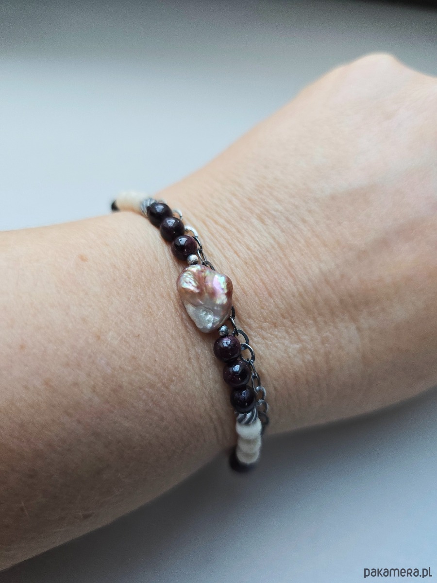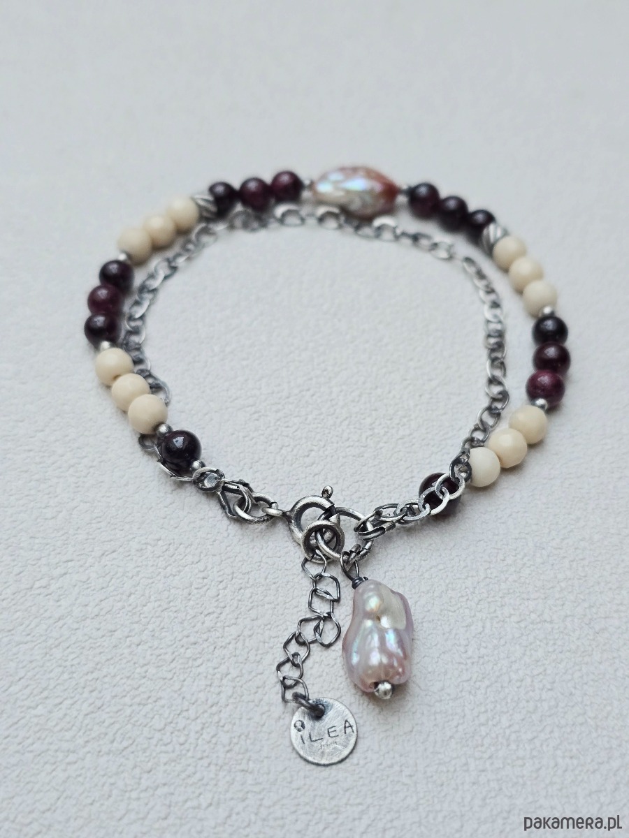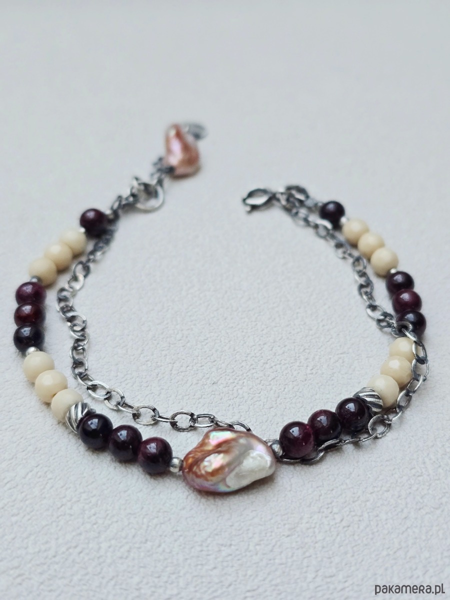 Wykonana z kamieni naturalnych tj.: granat, kamień rzeczny, perły naturalne w odcieniu beżu