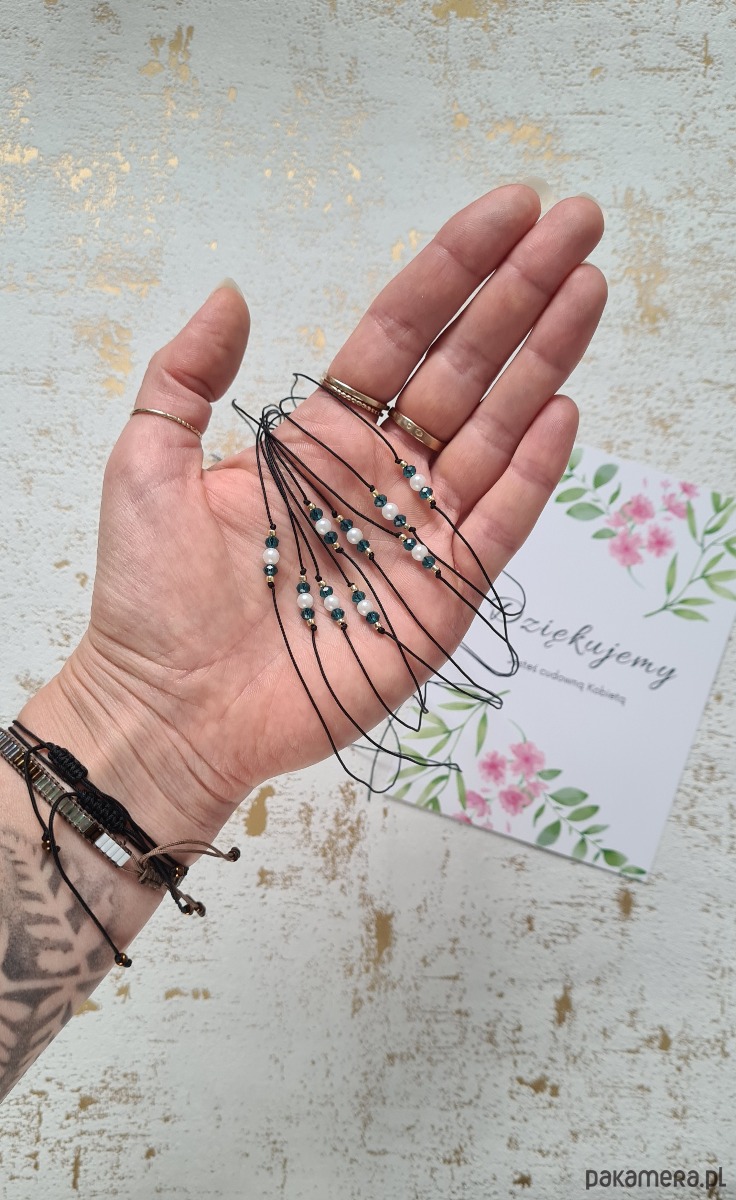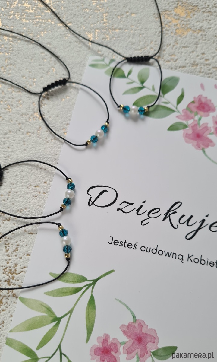 Do każdej bransoletki dodaję kartę z afirmacją, kartkę z podziękowaniem i ozdobne pudełko.
