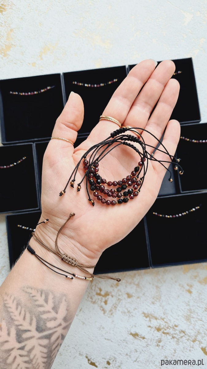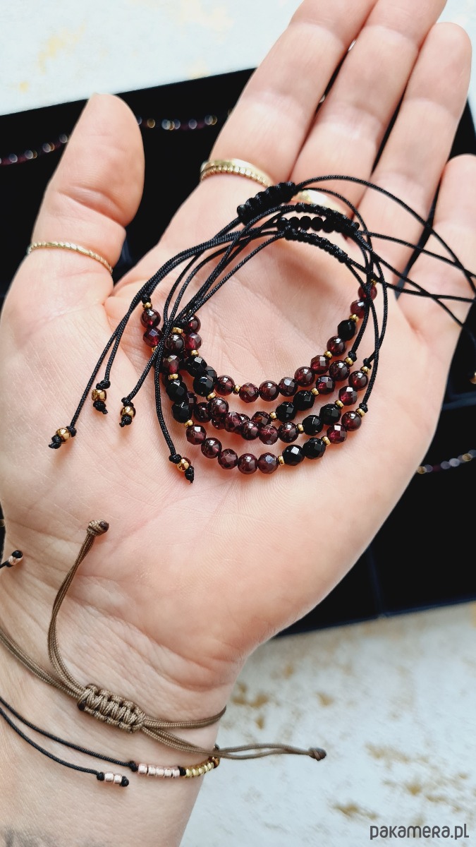 Bransoletka DZIĘKUJĘ, wykonana z granatów gładkich i fasetowanych, złotych hematytów oraz onyksów.