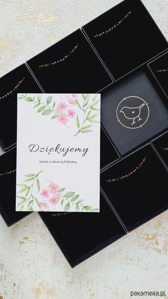 Do każdej bransoletki dodaję kartę z afirmacją, kartkę z podziękowaniem i ozdobne pudełko.