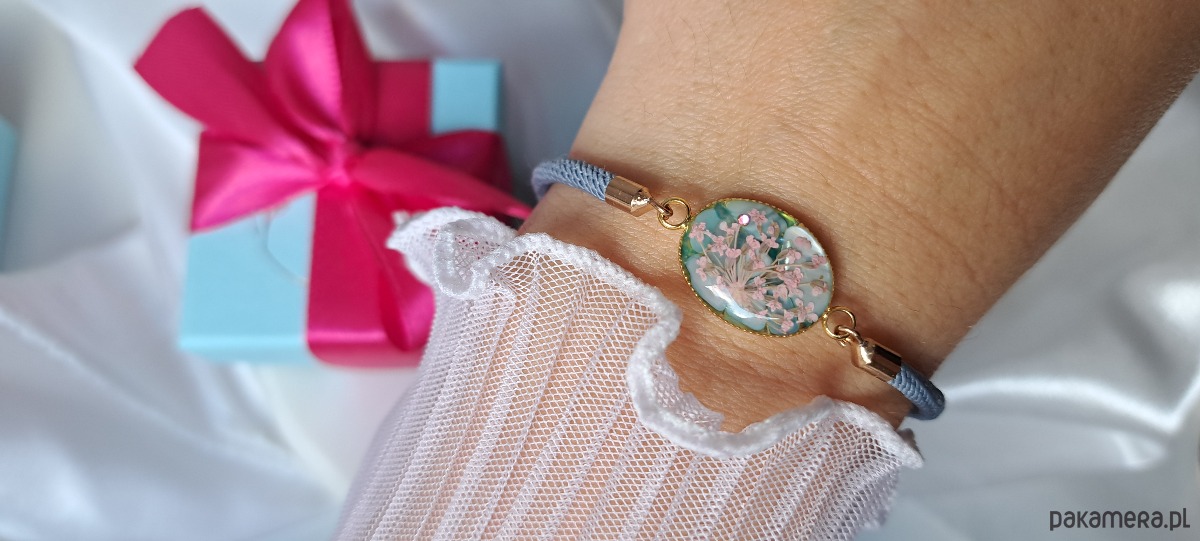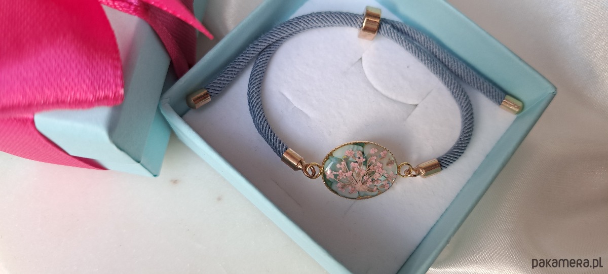 Bransoletka z owalną zawieszką, różowymi kwiatami dzikiej marchwi na tle z błękitnych muszli