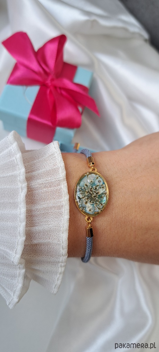 Ręcznie wykonana bransoletka z prawdziwych kwiatów i naturalnych elementów.