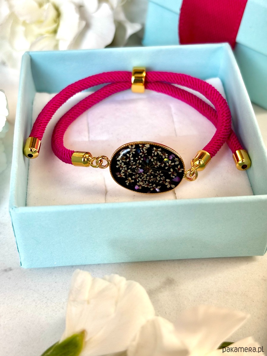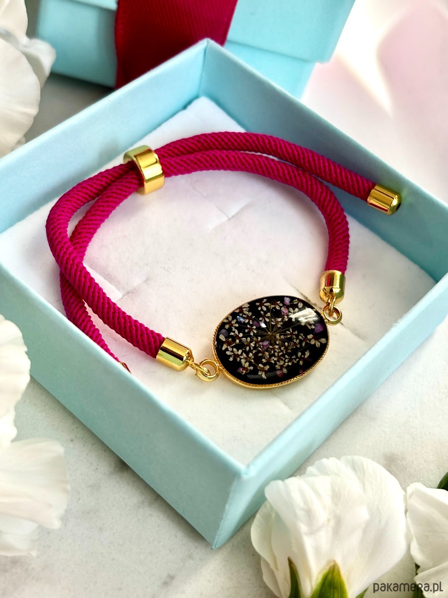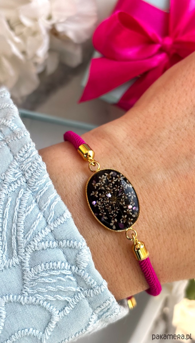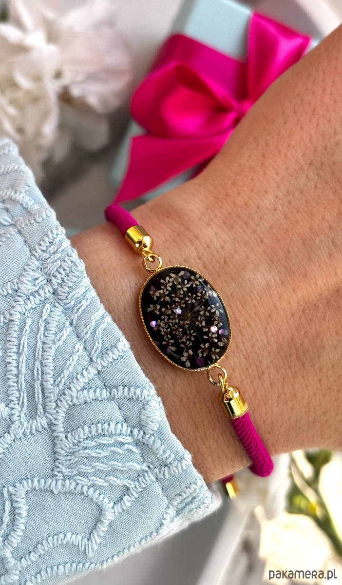 Bransoletka z owalną zawieszką, kwiatami dzikiej marchwi na czarnym tle