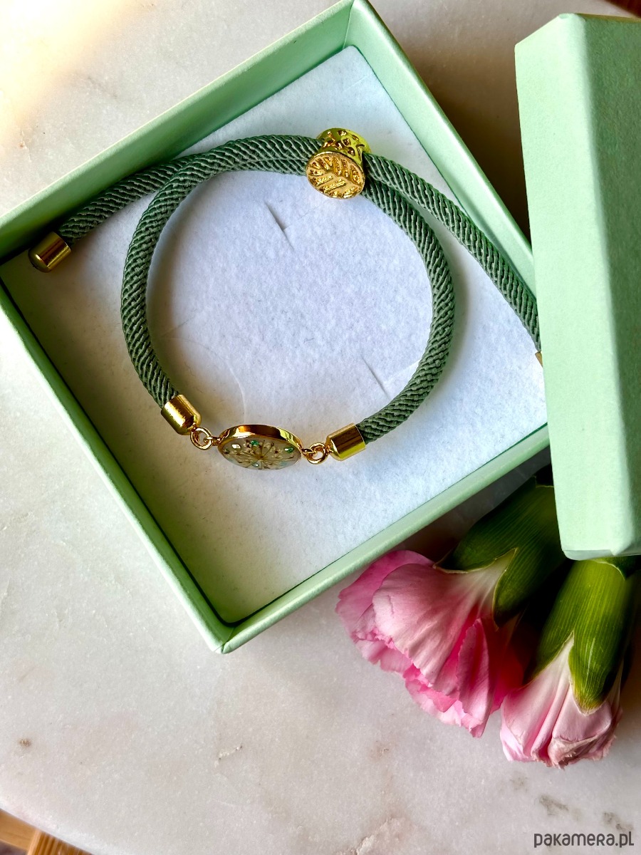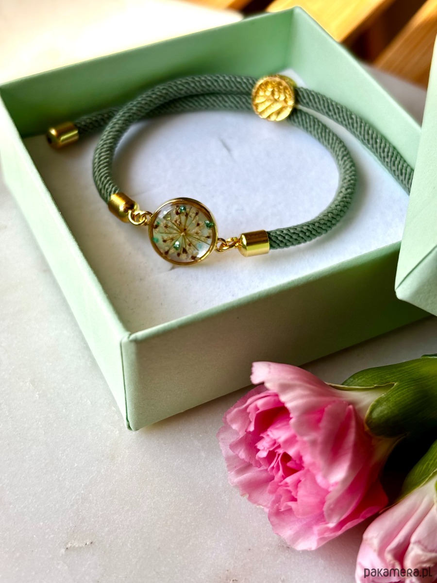Ręcznie wykonana bransoletka z prawdziwych kwiatów i naturalnych elementów.
