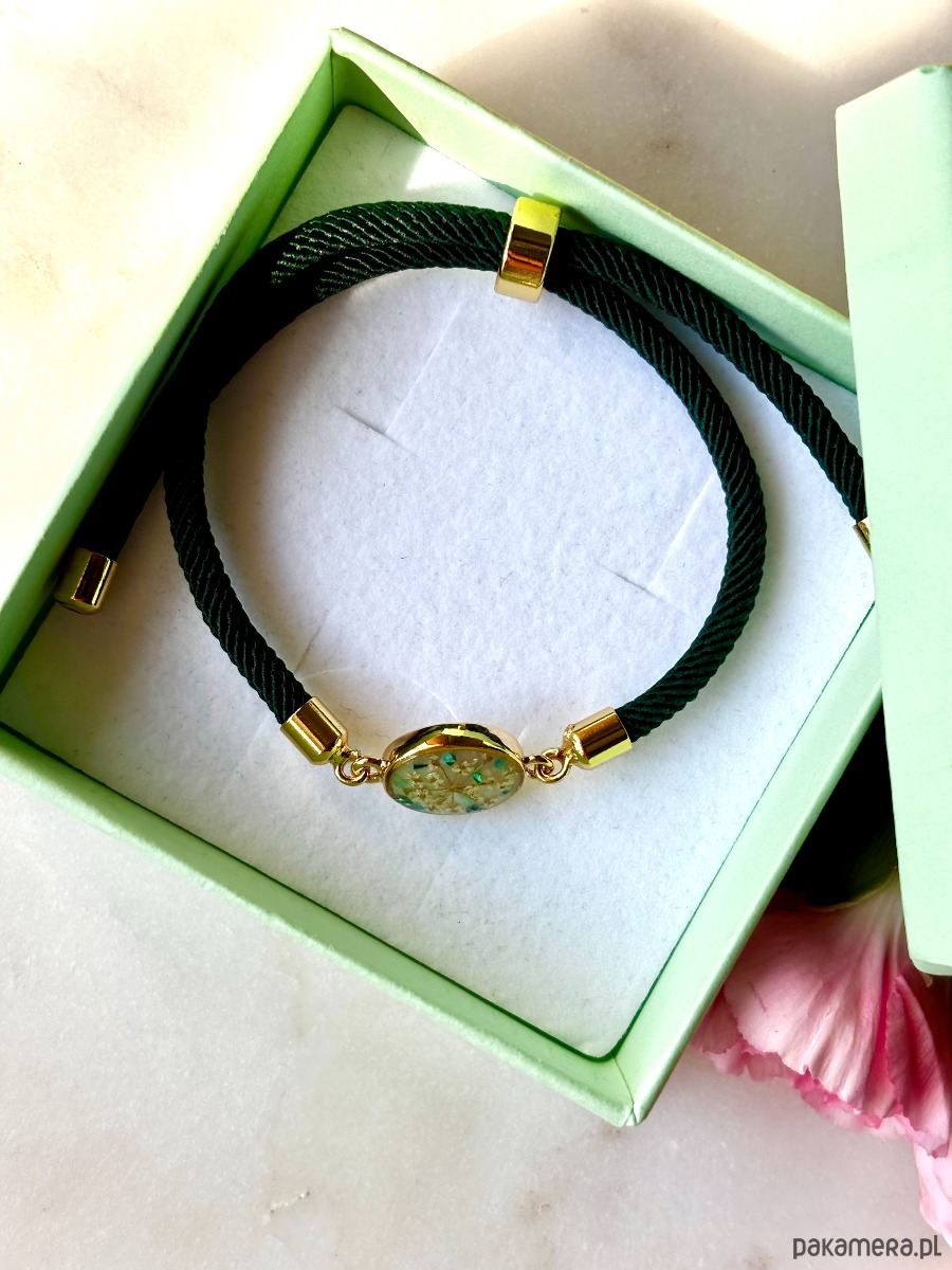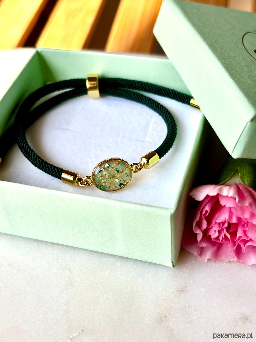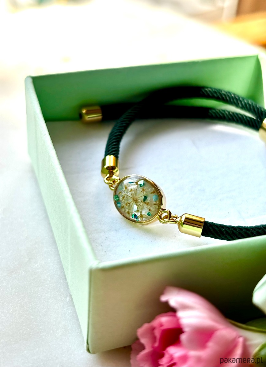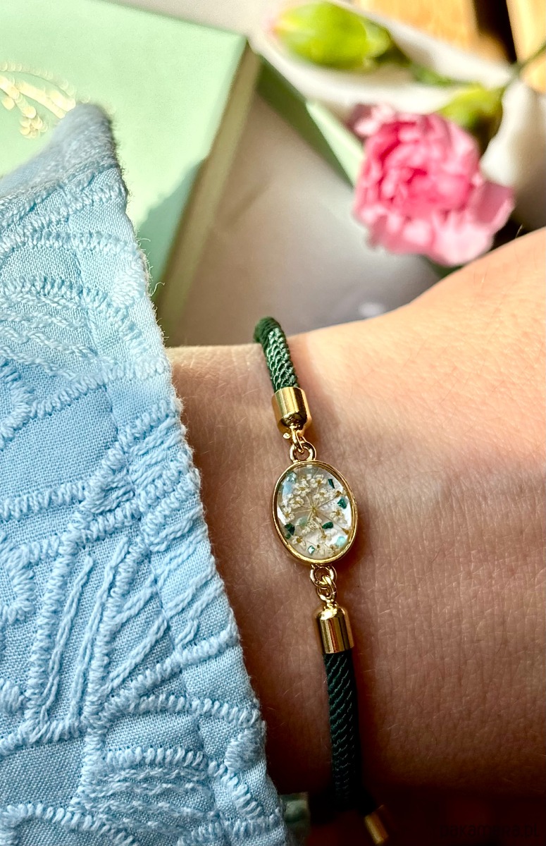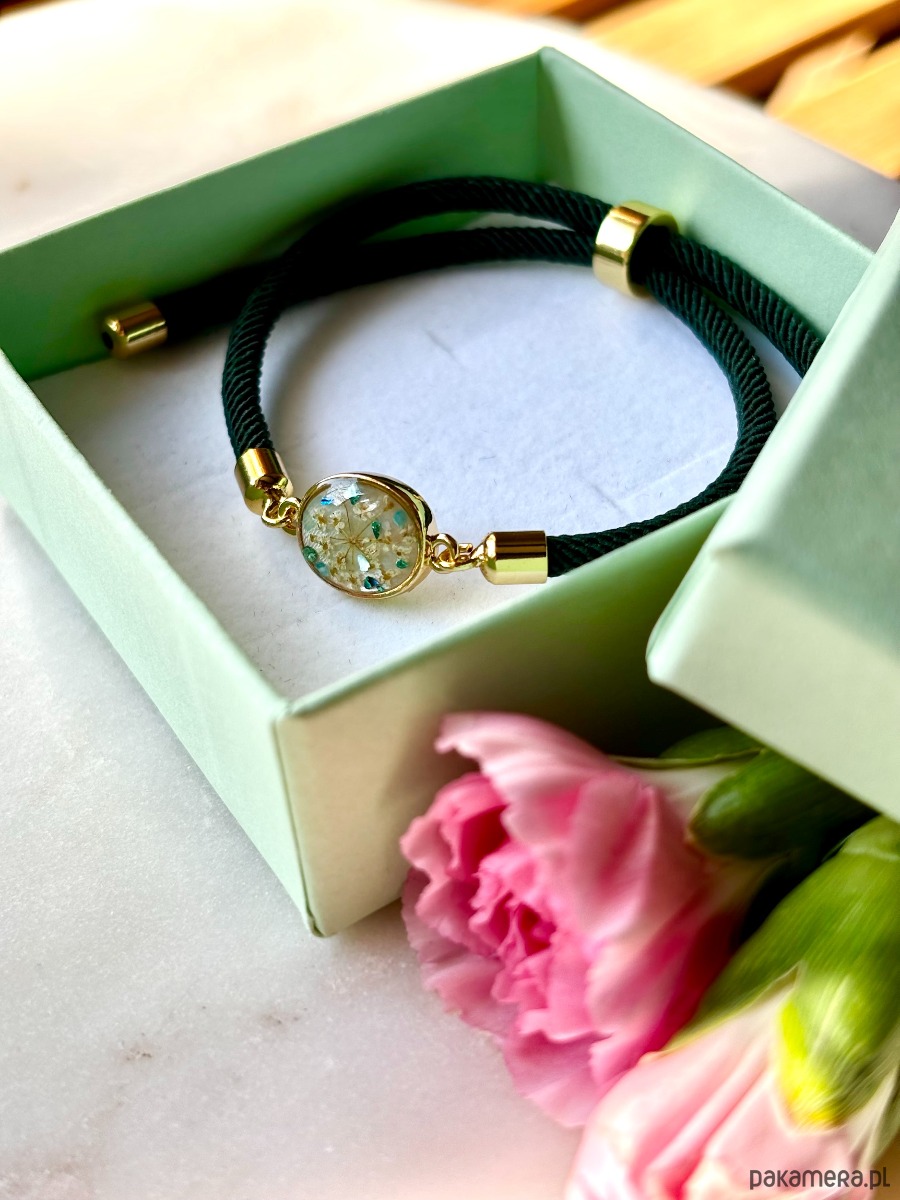 Ręcznie wykonana bransoletka z prawdziwych kwiatów i naturalnych elementów.