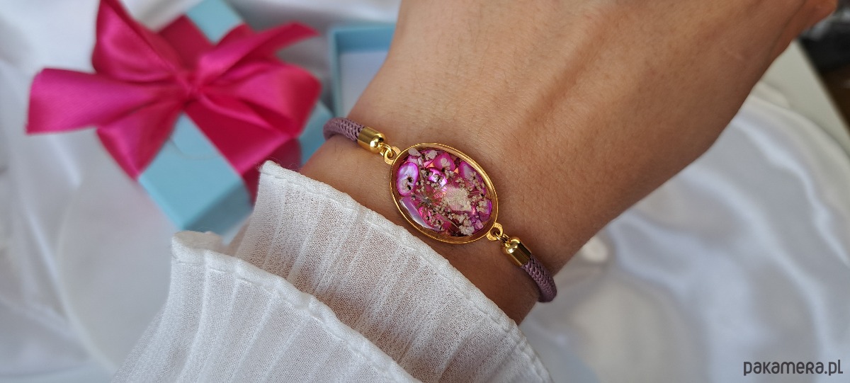 Ręcznie wykonana bransoletka z prawdziwych kwiatów i naturalnych elementów.
