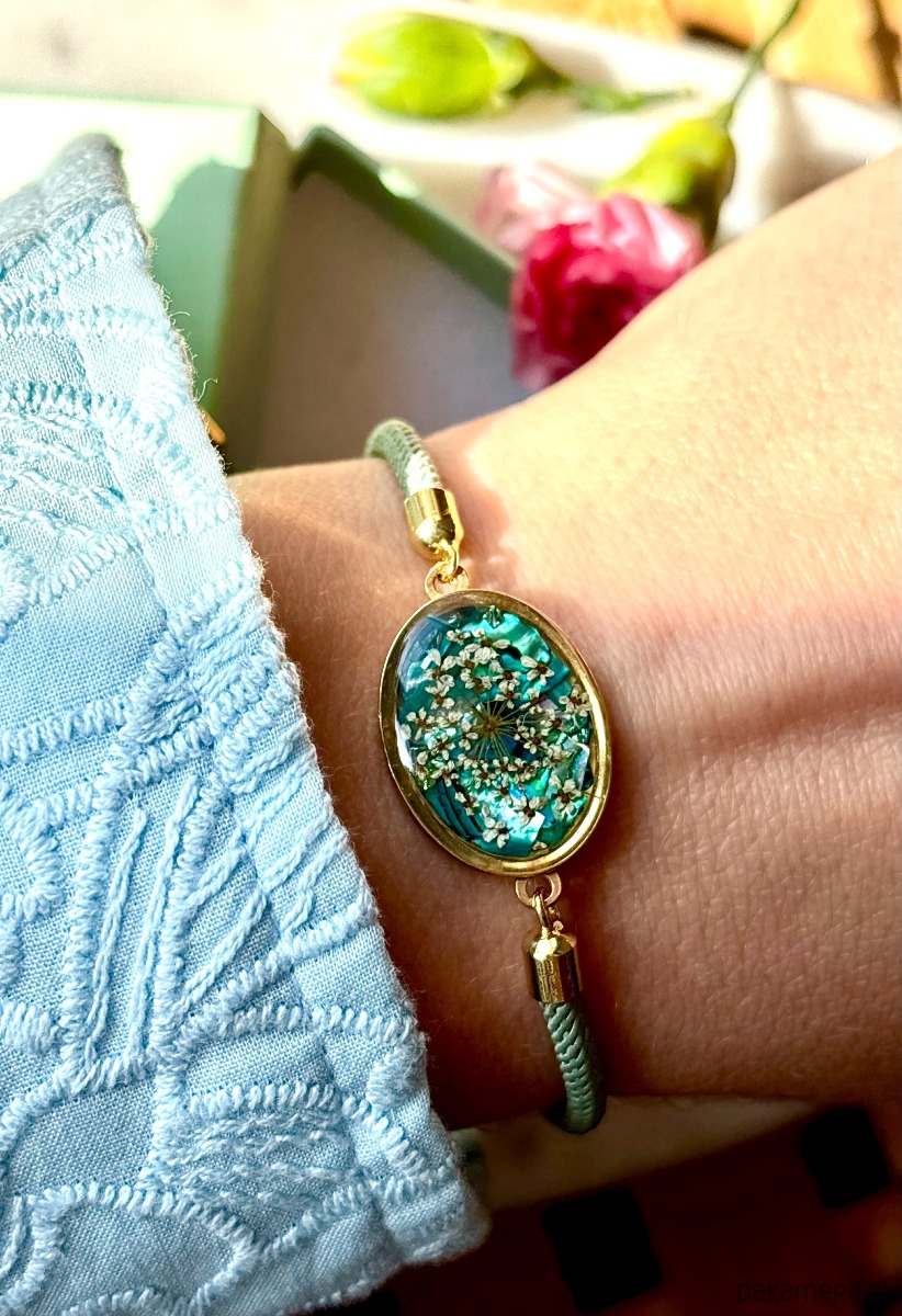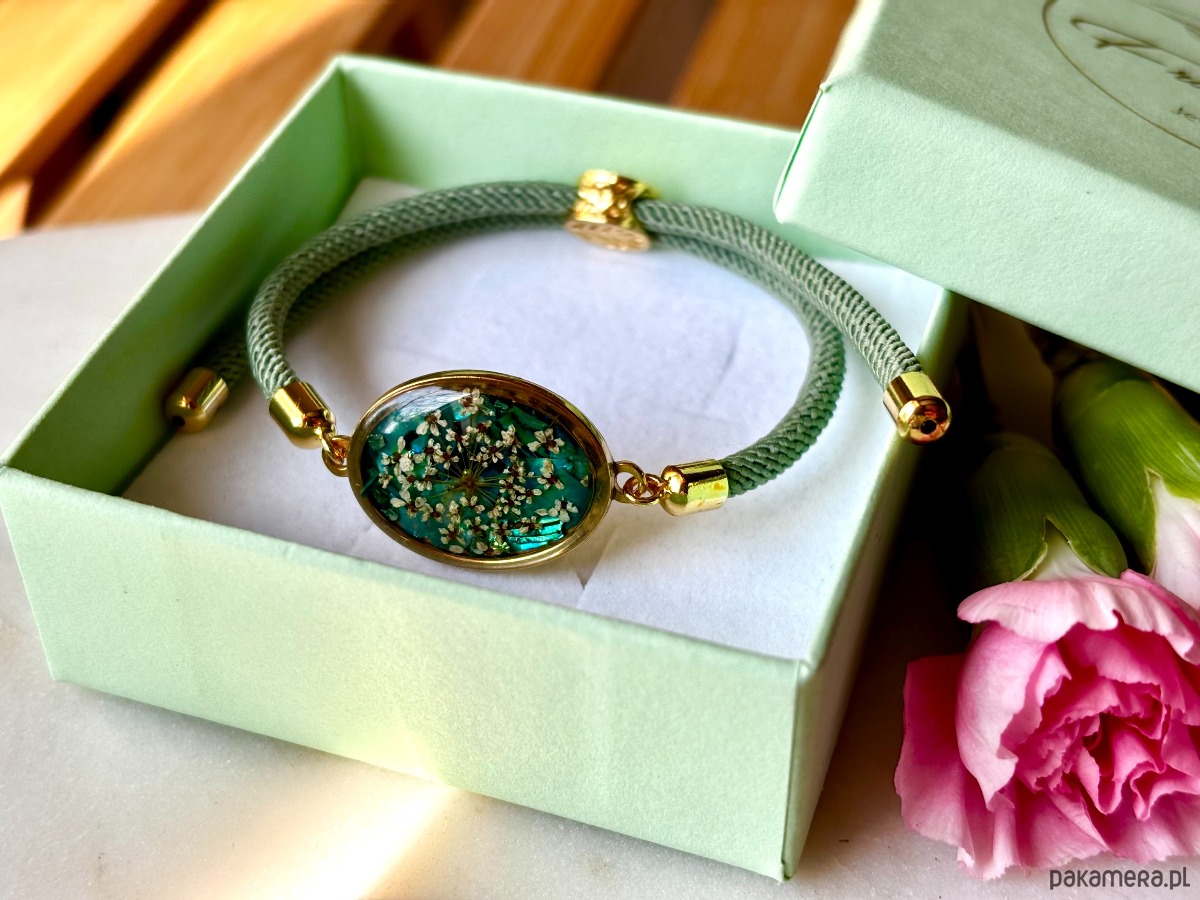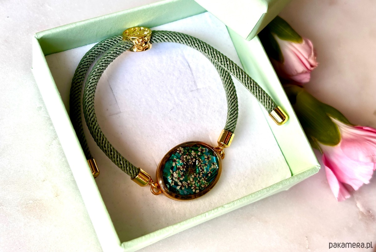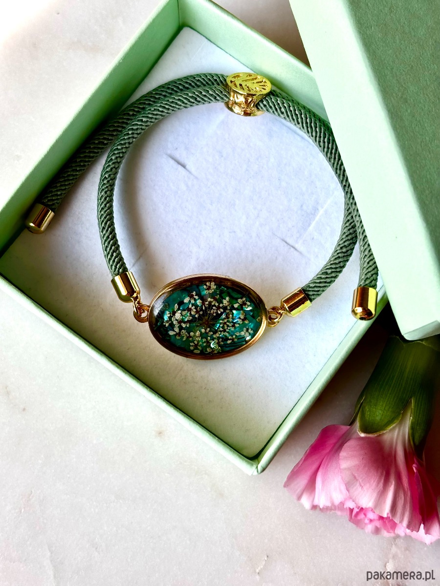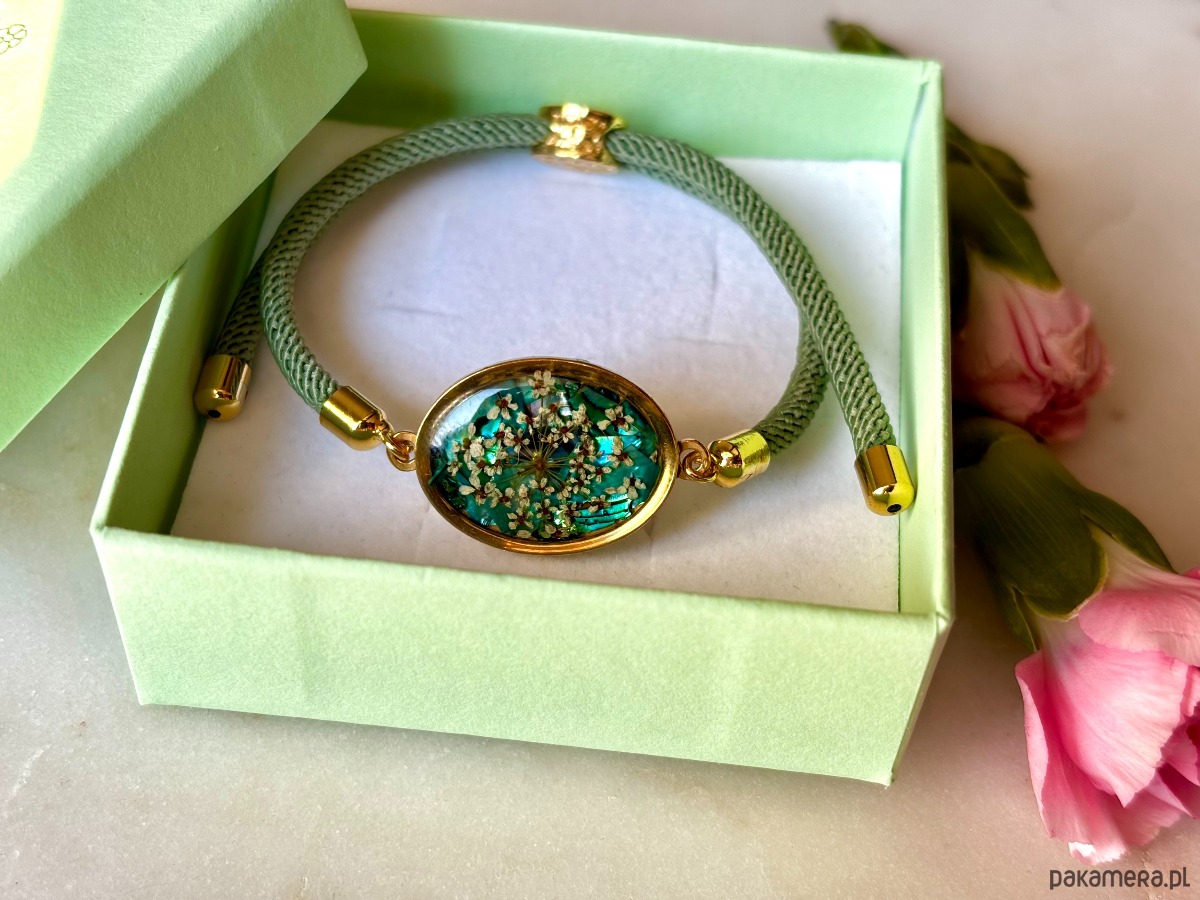 Bransoletka z kwiatami dzikiej marchwi, na tle wykonanym z kawałków szmaragdowej masy perłowej