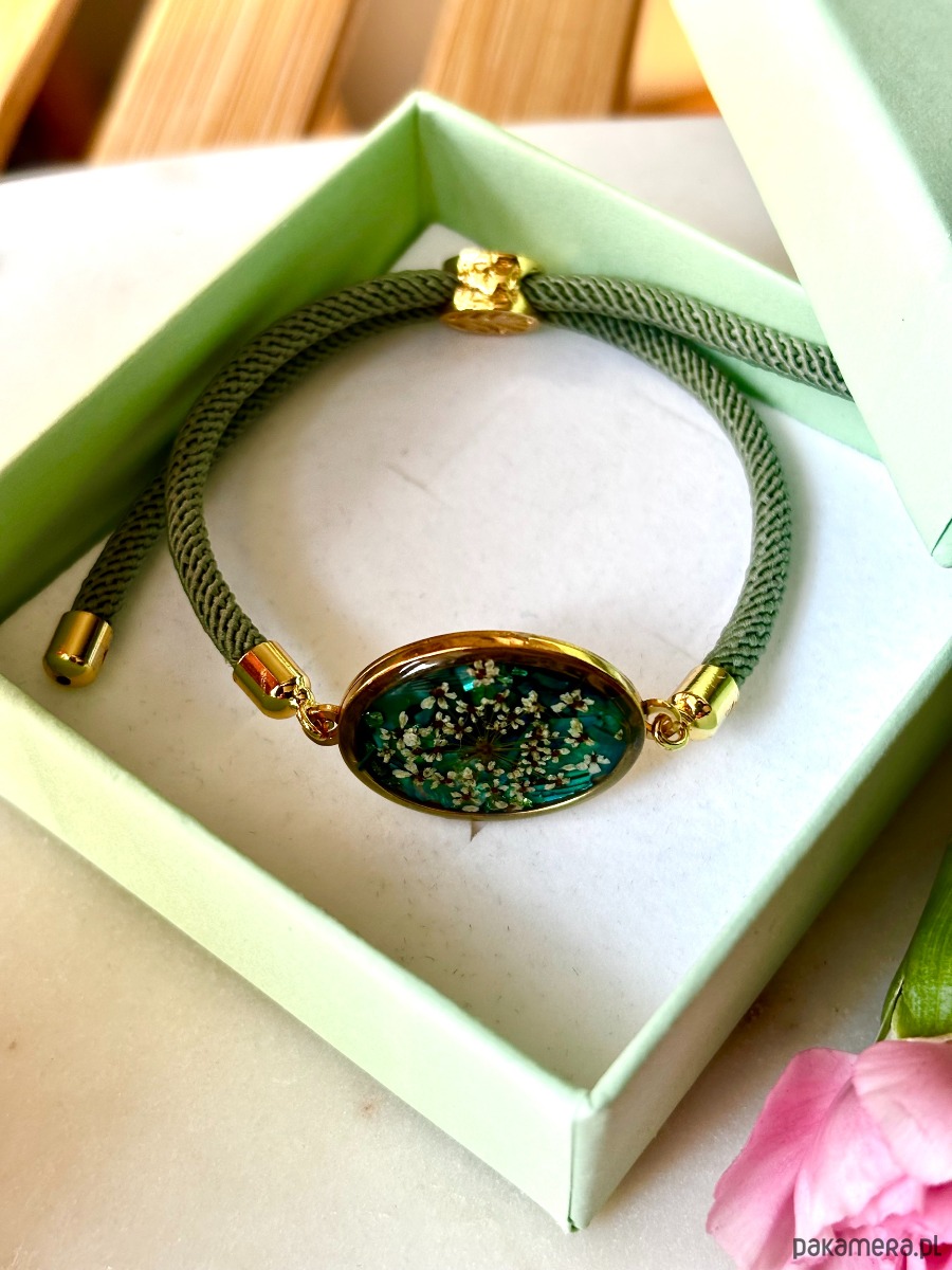 Ręcznie wykonana bransoletka z prawdziwych kwiatów i naturalnych elementów.
