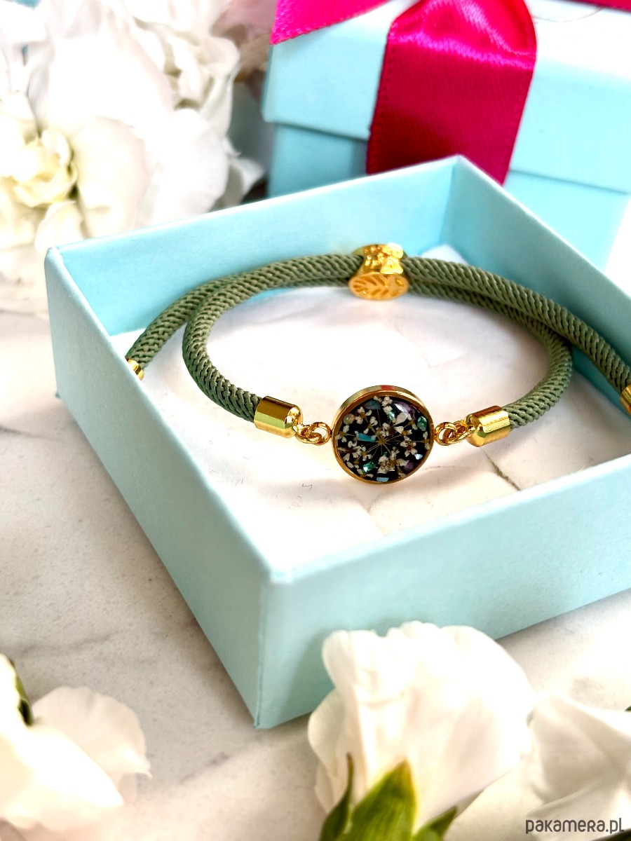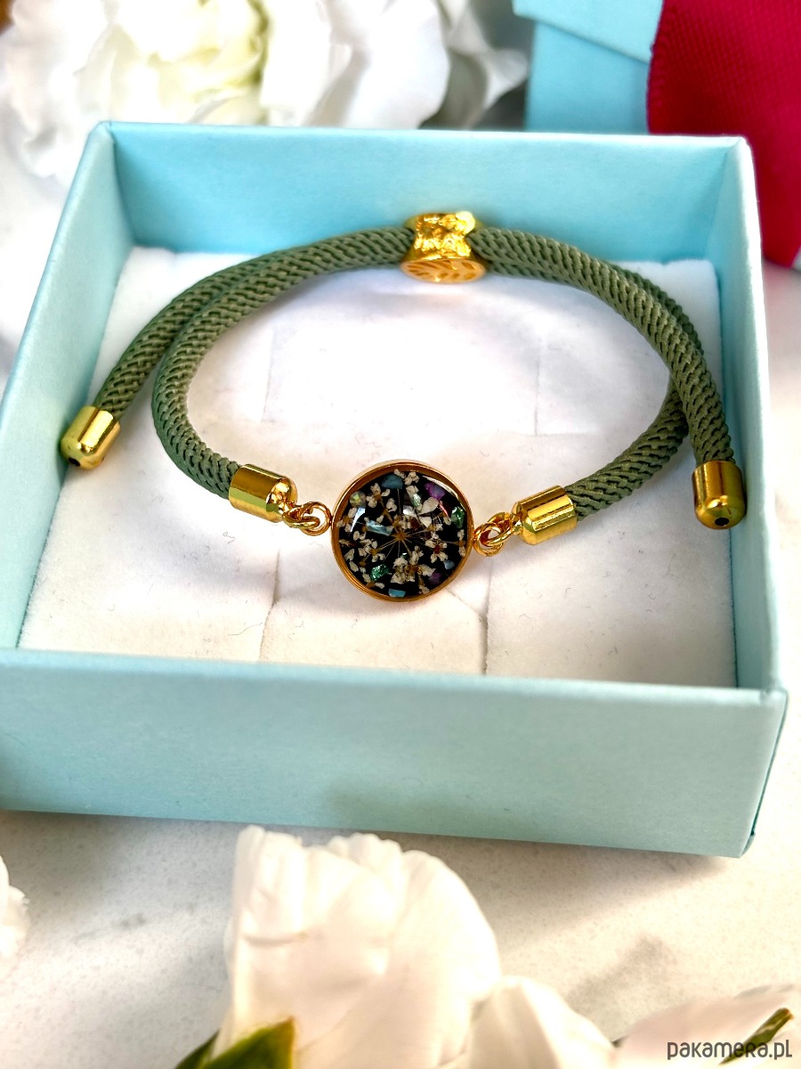 Ręcznie wykonana bransoletka z prawdziwych kwiatów i naturalnych elementów.