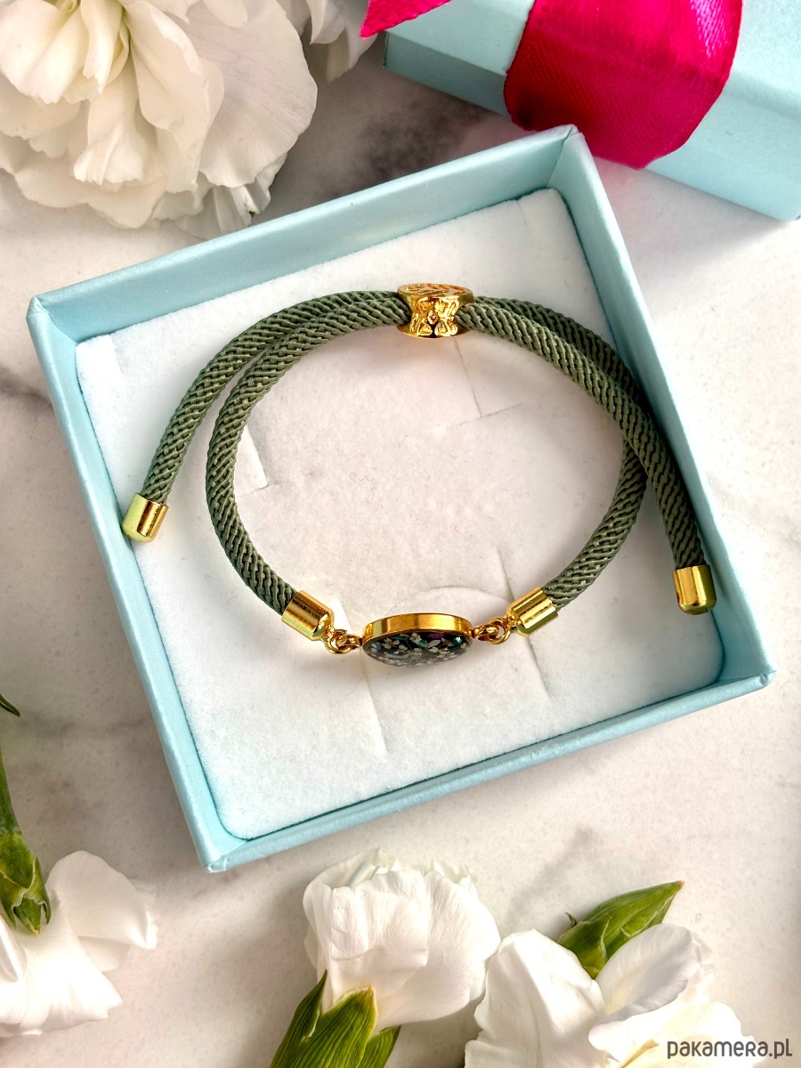 Pleciony, szary sznurek w połączeniu ze złotymi elementami nadaje bransoletce minimalistyczny, ale wyrafinowany charakter. To idealna bransoletka damska handmade, która pasuje zarówno do codziennych stylizacji, jak i eleganckich zestawów. Neutralna kolorystyka sprawia, że łatwo dopasować ją do innych dodatków.