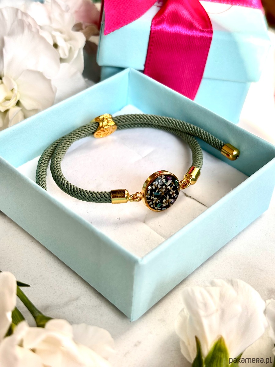 Ta elegancka bransoletka z suszonymi kwiatami w żywicy to subtelne połączenie natury i nowoczesnego designu. Centralnym elementem jest okrągła zawieszka z delikatną kompozycją drobnych, ręcznie suszonych kwiatów oraz roślinnych detali zatopionych w głębokim, ciemnym tle. Transparentna żywica podkreśla każdy szczegół, tworząc efekt przestrzeni i naturalnej lekkości.