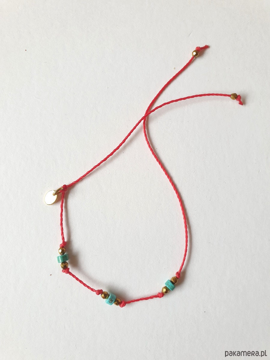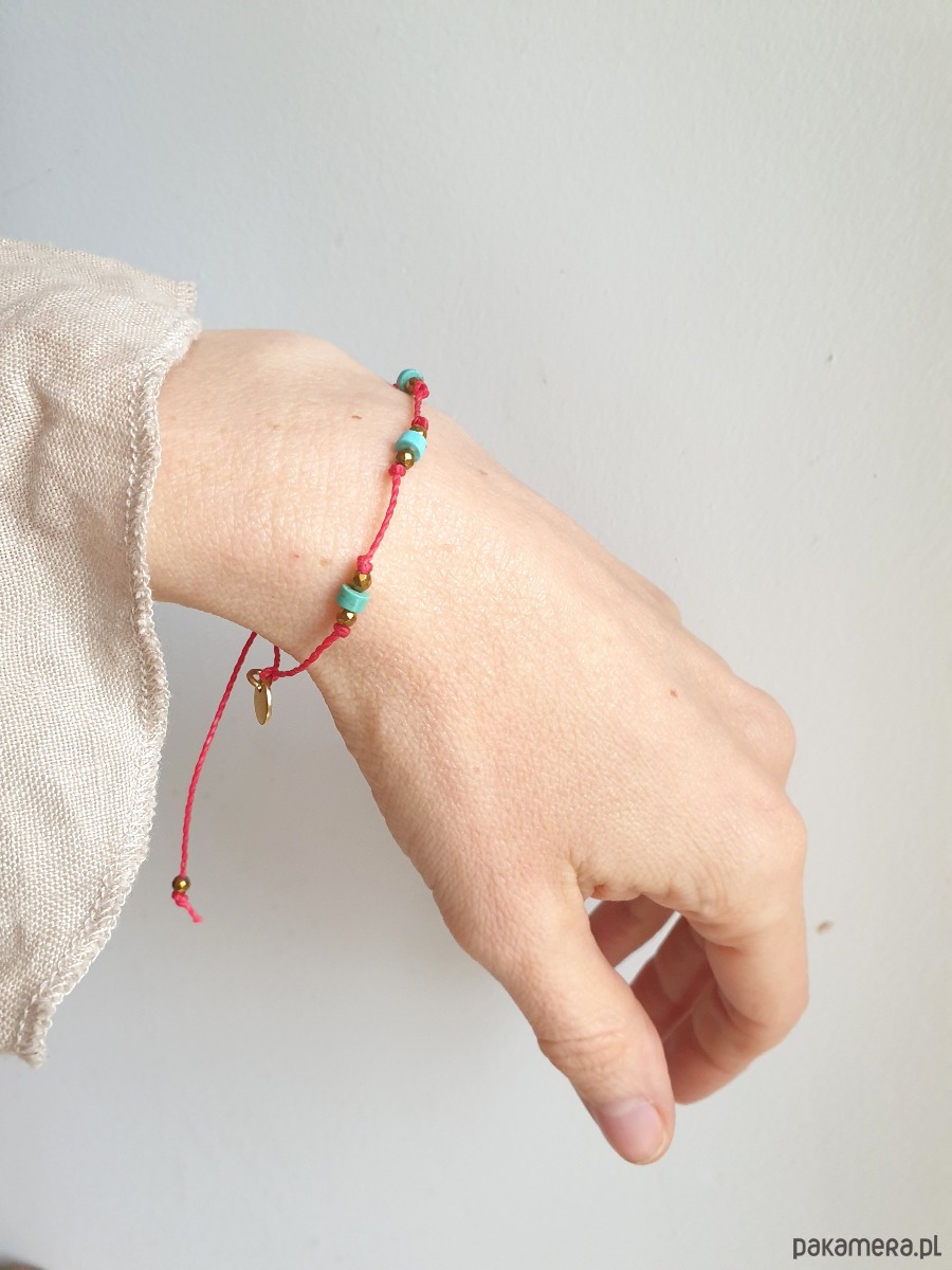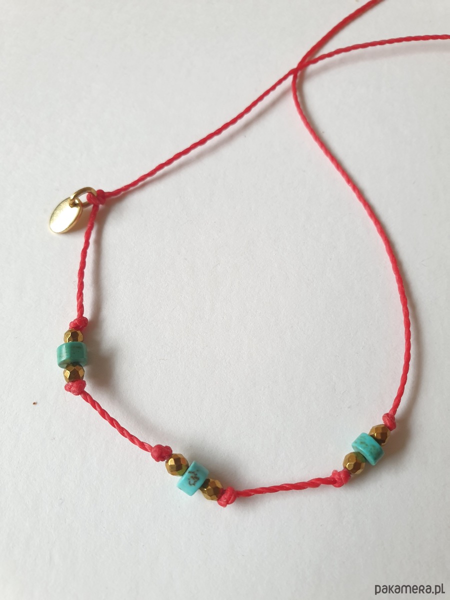 Delikatna bransoletka na czerwonym sznurku z kamieniami naturalnymi i elementami ze stali szlachetnej złoconej. W tej - fasetowany złoty hematyt, drobne turkusy naturalne. Bransoletkę można dopasować rozmiarem do dłoni. Sznurek polyestrowy woskowany marki Linhasita którego cechuje wysoka odporność na rozciąganie i zadarcia, jest wodoodporny. Bransoletka tworzona na zamówienie, z tych samych elementów i w tych samych kolorach jednak może się minimalnie różnić bo każdy kamień jest wyjątkowy. Bransoletka do samodzielnego zawiązania na zwykły supełek, lub na zdjęciu masz dwie dodatkowe propozycje zawiązania 1. dwa węzełki przesuwne 2. węzeł marynarski