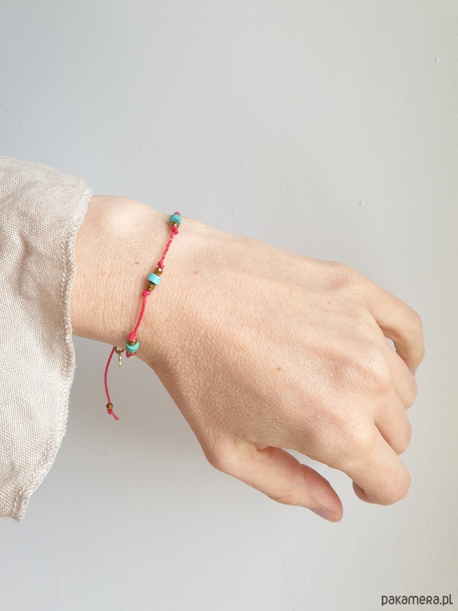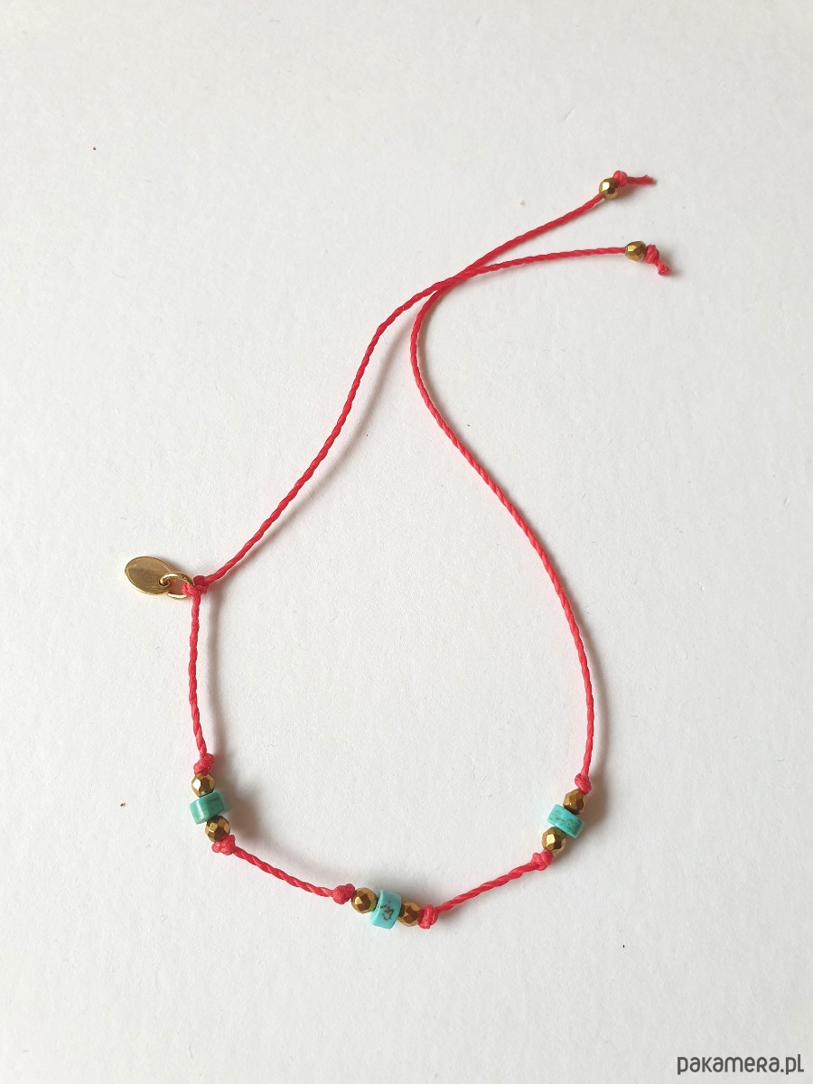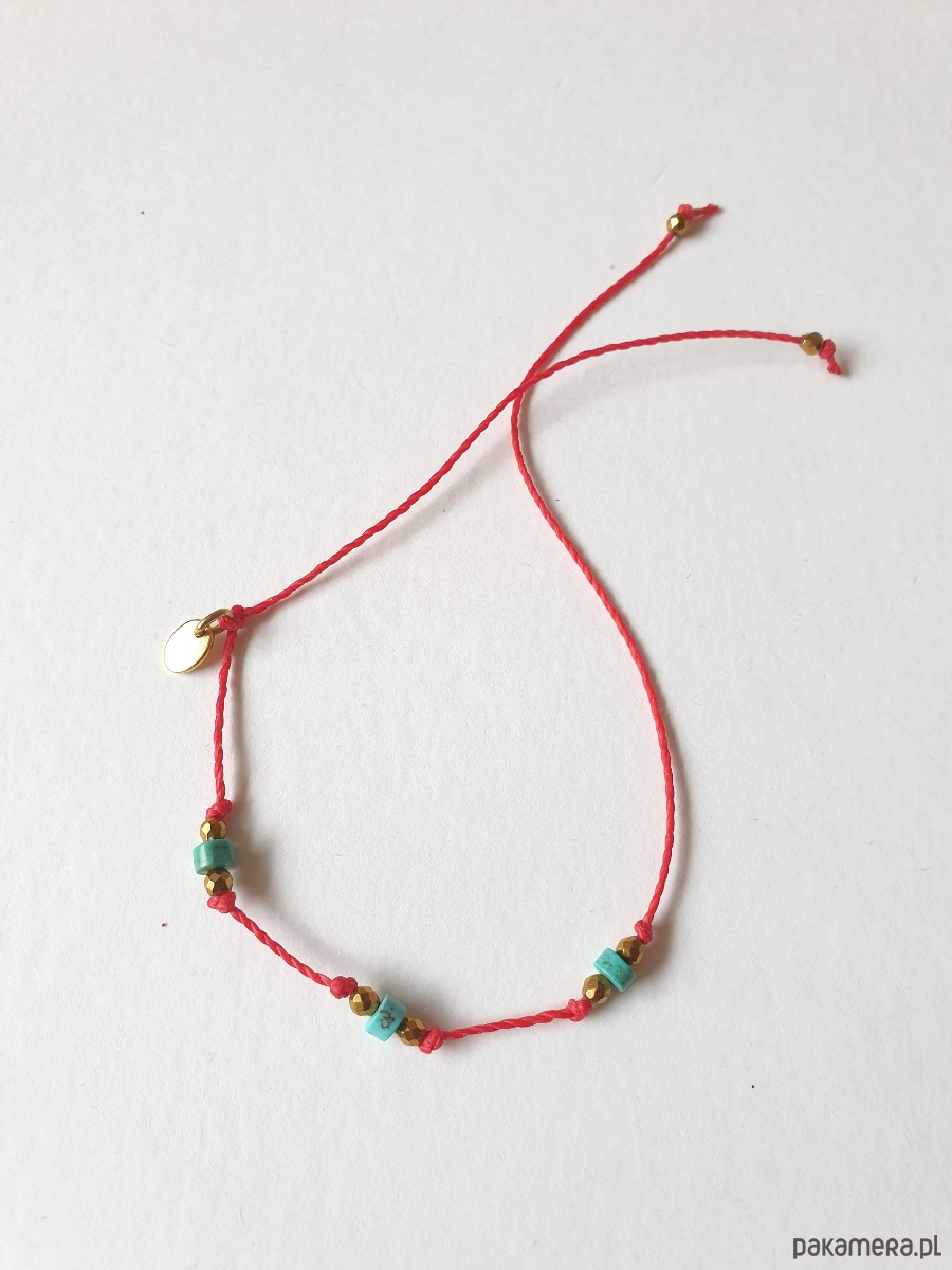 Delikatna bransoletka na czerwonym sznurku z kamieniami naturalnymi i elementami ze stali szlachetnej złoconej. W tej - fasetowany złoty hematyt, drobne turkusy naturalne. Bransoletkę można dopasować rozmiarem do dłoni. Sznurek polyestrowy woskowany marki Linhasita którego cechuje wysoka odporność na rozciąganie i zadarcia, jest wodoodporny. Bransoletka tworzona na zamówienie, z tych samych elementów i w tych samych kolorach jednak może się minimalnie różnić bo każdy kamień jest wyjątkowy. Bransoletka do samodzielnego zawiązania na zwykły supełek, lub na zdjęciu masz dwie dodatkowe propozycje zawiązania 1. dwa węzełki przesuwne 2. węzeł marynarski